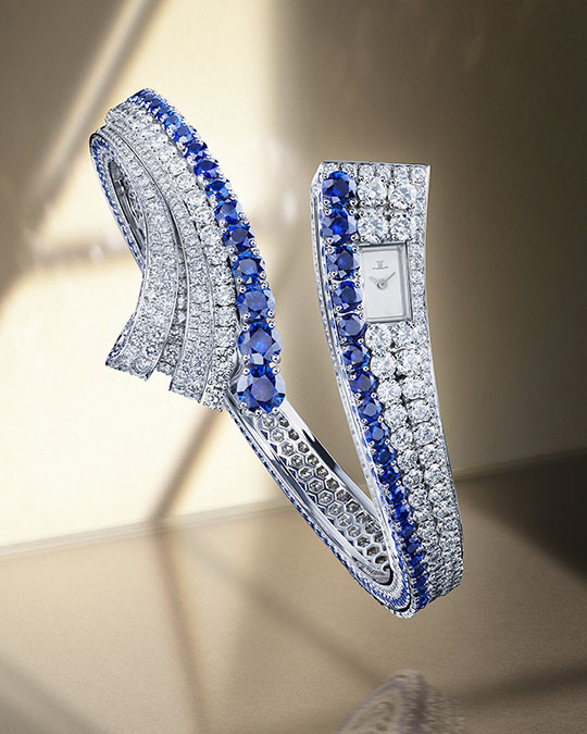 In 2023, Jaeger-LeCoultre presented three new timepieces, two of which were new versions of the Calibre 101 Bangle with a touch of colour, and one was a fresh design in the collection. One of the two Calibre 101 Bangle timepieces featured a red lacquer dial complemented by diamonds studded over a pink-gold bracelet. For the other model, the watchmaker used a white-gold case adorned with diamonds and a streak of 347 brilliant-cut blue sapphires in a graduated demeanour, weighing 10.29K. Amid the gemstones sat a snow-white lacquer dial.