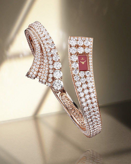 Significant timepieces by Jaeger-LeCoultre that housed this tiny movement included the Calibre 101 Feuille, created in the year 1959, with a secret dial covered by a leaf motif, which is raised to reveal the silvered opaline dial with baton hour and minute hands. The Feuille is also made in two variations of white (Ref. Q2863303) and pink gold (Ref. Q2862201). Both models are entirely studded with gemstones—the white-gold piece has 171 round-cut diamonds laid out in griffe and grain settings, and the pink-gold is adorned with 167 diamonds in griffe, grain, and baguette settings. However, the total carat weight of the diamonds is 10.13K in both cases.