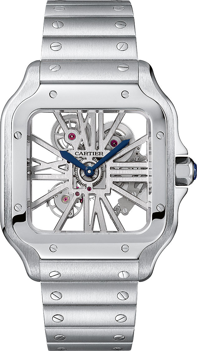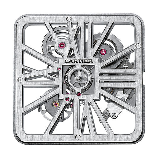 Cartier developed a custom-made watch movement for the 2013 Santos 100 Skeleton: The 9611 MC. This skeletonised hand-wound calibre measures 28.6-mm square and was carefully made by Cartier to match the dimensions of the watch case. Included among highlights of the 9611 MC are the skeletonised bridges, which at 3, 6, 9 and 12 o’clock are fashioned like the Roman numerals III, VI, IX, and XII, thereby allowing the watch movement to function as the dial. Skeletonising also permits the wearer to see through the watch and view the movement components.