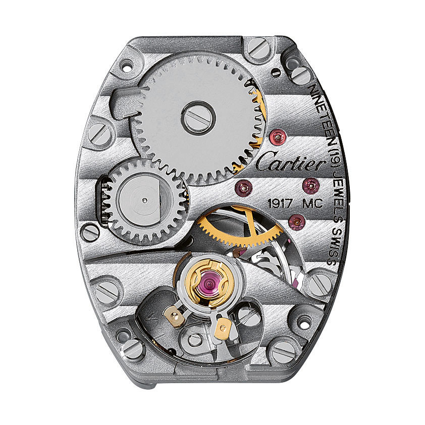 The hand-wound 1917 MC is one of the few Cartier calibres in a tonneau, or barrel, shape. With its name, the in-house movement pays tribute to its creation the Cartier Tank Tribute, developed in 1917 and presented internationally to the public in 1919. The challenge in the conception of the 1917 MC consisted in modifying the conventional, round movement architecture to the barrel-shaped mainplate. The movement measures just 12.9mm in width and 16.4mm in length and is one of the most important Cartier movements for shaped watches that have a basic rectangular form. In this way, the 1917 MC fits especially well in the Cartier Tank models—including in the Tank Louis Cartier and in the Tank Asymétrique, but also in the mechanically powered Baignoire and Cloche references. The power reserve of the 2.9-mm-high hand-wound movement is about 38 hours.