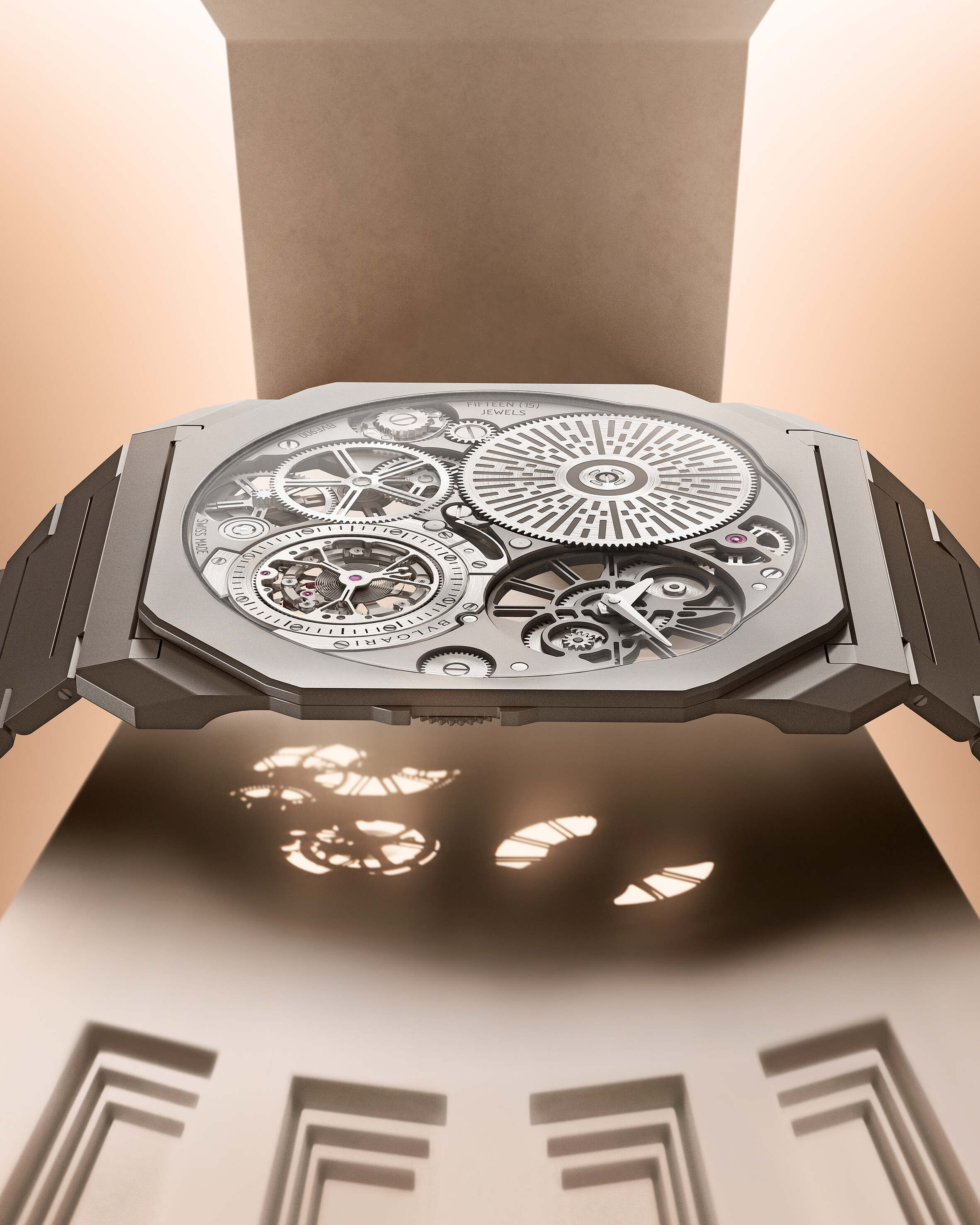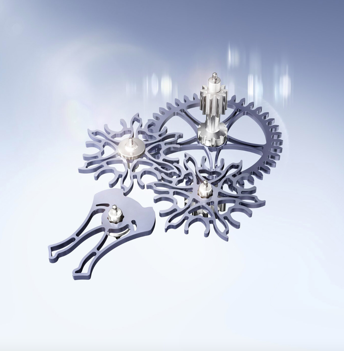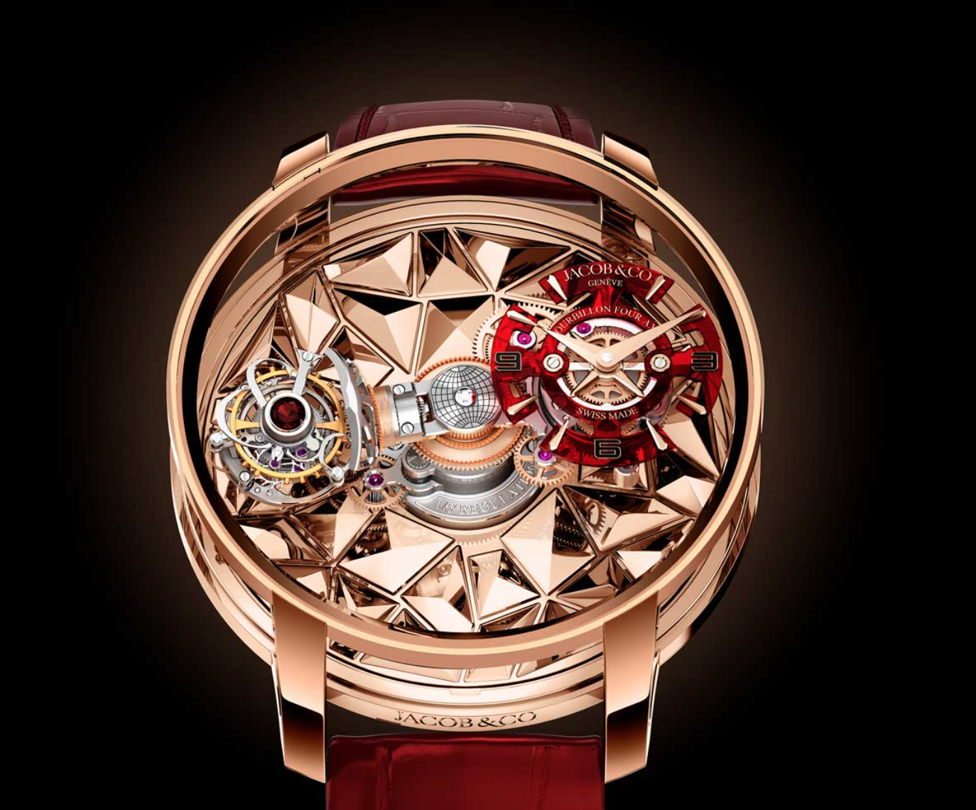 Jacob & Co. introduced a world-first quad-axial tourbillon with the fastest remontoir in its Astronomia Revolution Fourth Dimension watch. While a standard tourbillon rotates on a single axis, this creation adds three more axes: The entire movement carriage completes a full rotation in 60 seconds on the first axis, the cage rotates on a second axis in 18 seconds, the mechanism rotates on a third axis in 15 seconds, the fourth axis sees the entire arm, dial included, complete a full rotation every 60 seconds—a dramatic acceleration from earlier Astronomia models, which first rotated in 20 minutes, then 10, and finally reached the one-minute cycle with the Revolution series. It is housed in a large, 47mm case, with domed sapphire crystals on the front and sides, providing an unobstructed, 360-degree view of the movement.