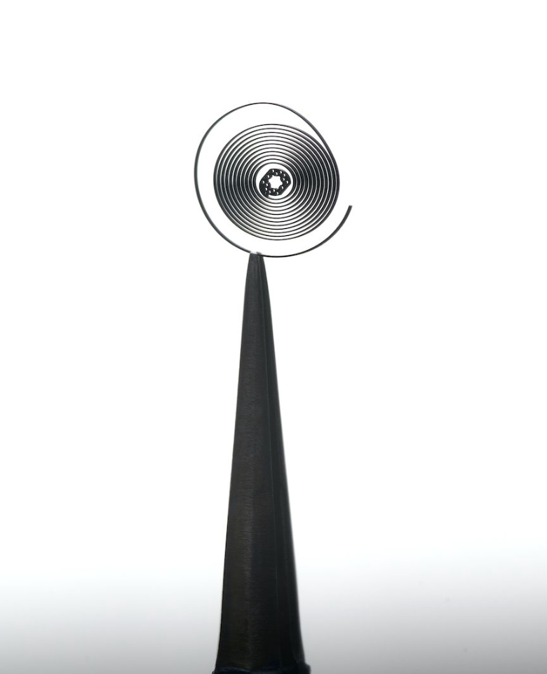 TAG Heuer developed TH-Carbonspring, a groundbreaking carbon composite hairspring developed entirely in-house over nearly a decade. Produced using a Chemical Vapor Deposition (CVD) technique, where hydrocarbon gases are decomposed at temperatures between 600–850°C, this process cultivates carbon nanotubes on a silicon wafer, forming a dense, homogenous spiral structure.