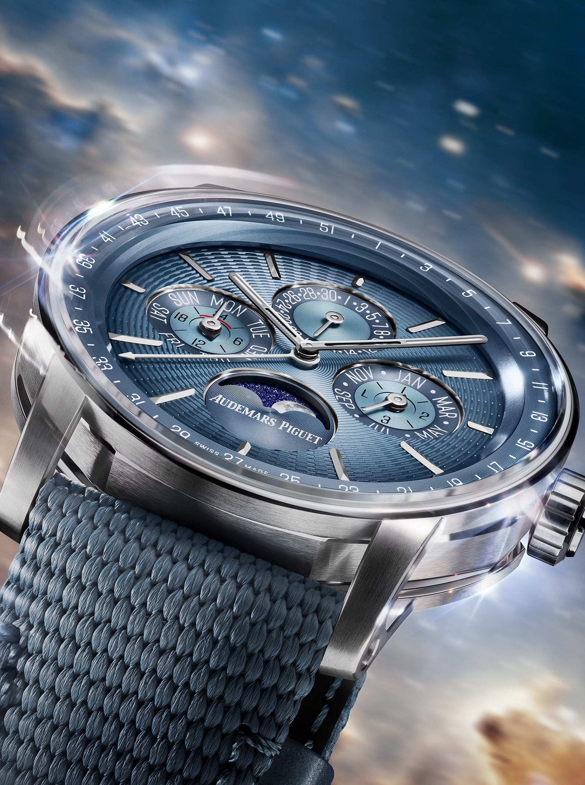 Audemars Piguet released Perpetual Calendar models for the brand's 150th anniversary with the Calibre 7138, a completely new movement for Audemars Piguet. It was developed over five years and featured an ‘All-in-one’ crown that offers complete control over the movement's perpetual calendar functions: Neutral position winds the watch, upon pulling once; turning the crown clockwise sets the date, while counter-clockwise sets the month and leap year. Pulling the crown fully sets the time, and upon pushing back one notch, clockwise setting sets the day and week, while counter-clockwise sets the astronomical moon.