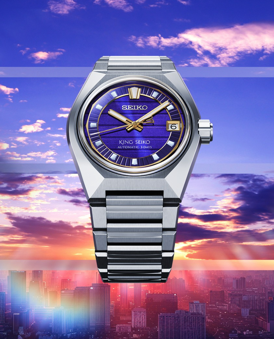 Seiko has revived one of its most vibrant chapters with the return of the King Seiko VANAC line in 2025, more than 50 years after its debut in 1972. The new VANAC watches embody the bold spirit of the 1970s with faceted cases and vivid dials—the original models were designed for a new generation of fashion-conscious collectors and stood out with their colourful aesthetics, faceted crystals, Hi-Beat movements, and integrated metal bracelets. Each of the four watches introduced take inspiration from Tokyo, the birthplace of King Seiko, interpreting the city’s horizon at different times of day. Leading the collection is the SLA083, featuring a deep purple dial textured with horizontal stripes and framed by golden dodecagonal details. Bold pentagon-shaped indexes, a signature ‘V’ motif at 12 o’clock, and LumiBrite-filled gold hands give the watch a dynamic presence. Measuring 41mm in stainless steel, the sharply angular case features distortion-free polished finishes, which extend to the faceted-link integrated bracelet. Powering these watches is the Caliber 8L45, visible for the first time in King Seiko through a sapphire caseback. With 72 hours of power reserve, +10/-5 seconds daily accuracy, and refined wave-pattern finishing, it unites performance with elegance. Alongside the purple edition, the collection includes SLA085 (navy), SLA087 (silver), SLA089 Limited Edition (gold, 700 pieces), and the boutique-exclusive SLA091 (ice-blue).