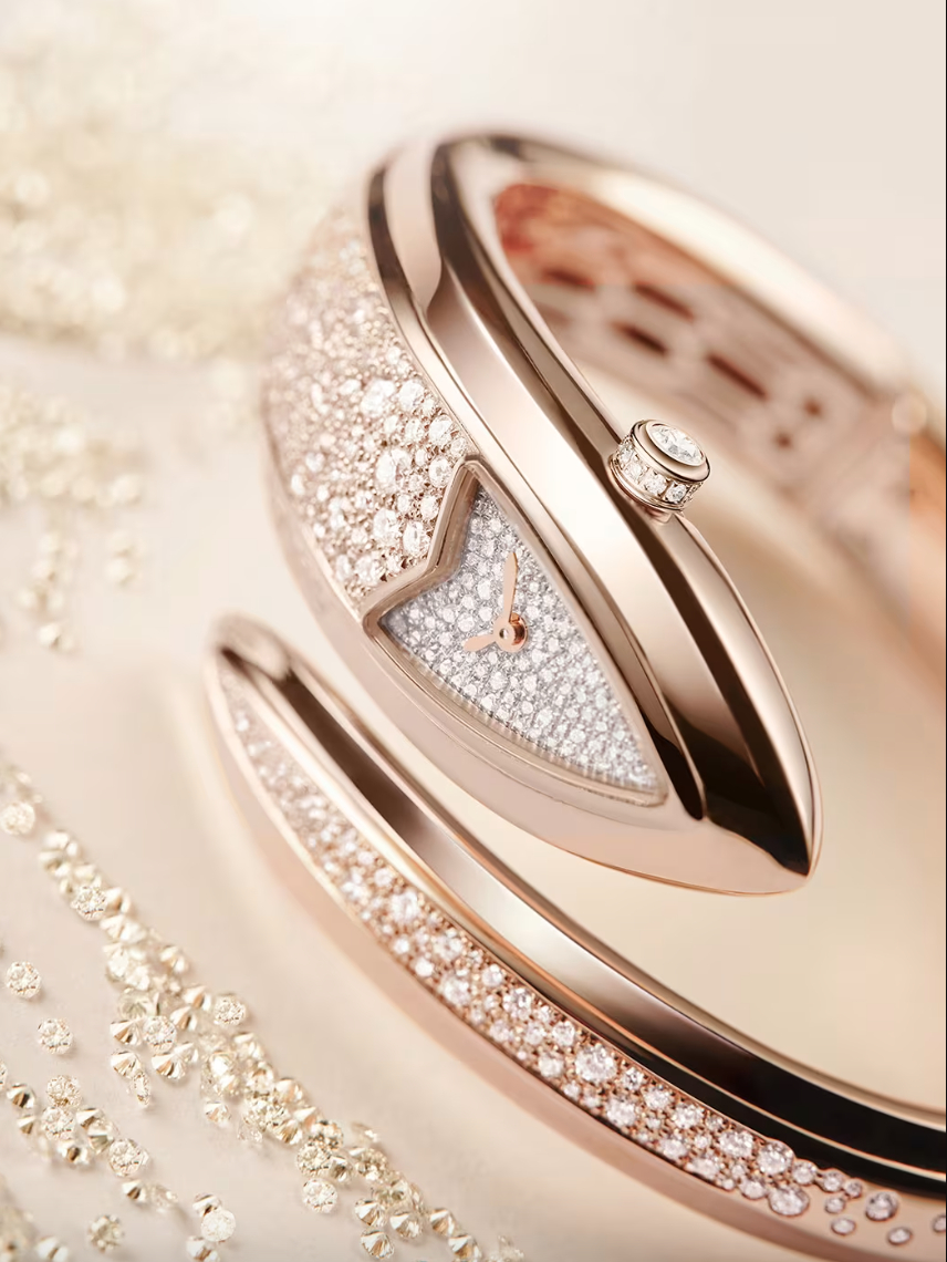 Bvlgari redesigned the iconic Serpenti watch this year, making it the most dramatic redesign ever of the Serpenti. Designer Fabrizio Buonamassa Stigliani created an avant-garde bangle that strips away traditional snake features, such as eyes and external scales, to focus on the serpent's pure, fluid form. The watch is now a tapered, angular, and elliptic bangle that softly wraps the wrist, with scales subtly etched into the inner contour. The white-gold (Ref. 104041) comes in a single 155mm size with green hands, while the pink-gold version features rose-gold hands and is offered in 145mm (Ref. 104205) and 155mm (Ref. 104280). They are also available in colourful gem-set models: Ref. 104265 comes decked with emeralds of varying size and hues, while Ref. 104266 comes with sapphires. Dials of both watches are also set with 107 diamonds.