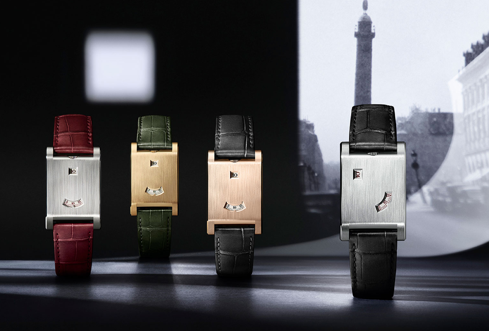 Cartier brought forth the Tank à Guichet model this year, a revival of the original 1928 models, while incorporating modern refinements and a newly developed caliber. Just like in the original models, the winding crown is positioned at 12 o'clock, but the watches are powered by the hand-wound 9755 MC caliber, a manufacture movement created specifically for this timepiece.