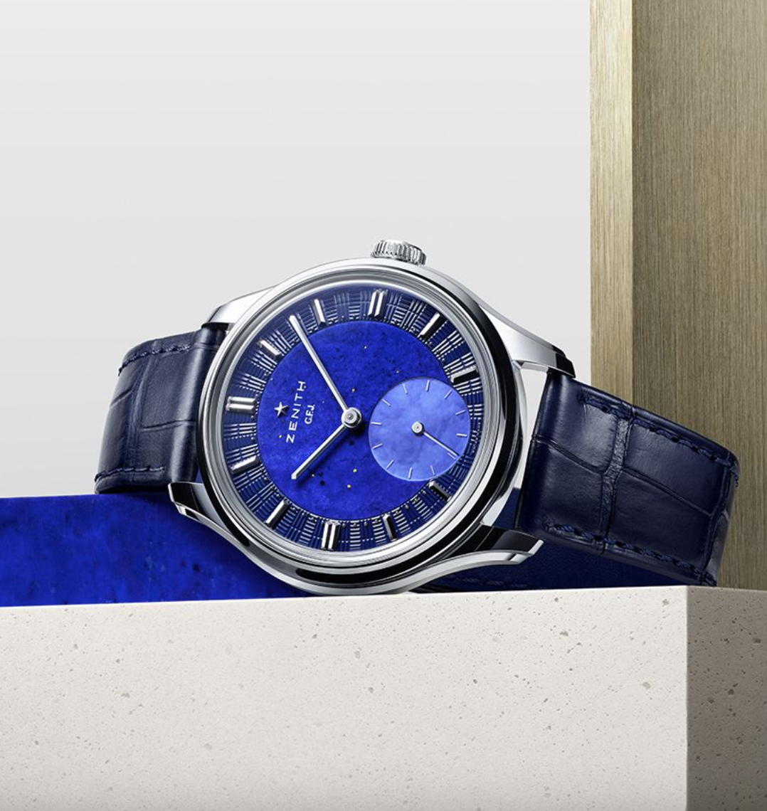 Zenith revived and recreated the Calibre 135, the most awarded movement from the golden age of observatory chronometer competitions (which began in the 1860s and concluded nearly a century later), in the latest G.F.J. (Georges Favre-Jacot) watch. With modern improvements in the movement, the power reserve has been extended from 40 to 72 hours, a stop-seconds (or hacking seconds) mechanism has been added for precise time-setting, and modern shock protection has been integrated. It is housed in the slender 39mm platinum round case featuring a stepped bezel and curved stepped lugs. Its three-part blue dial combines a brick guilloche pattern, lapis lazuli and mother-of-pearl.