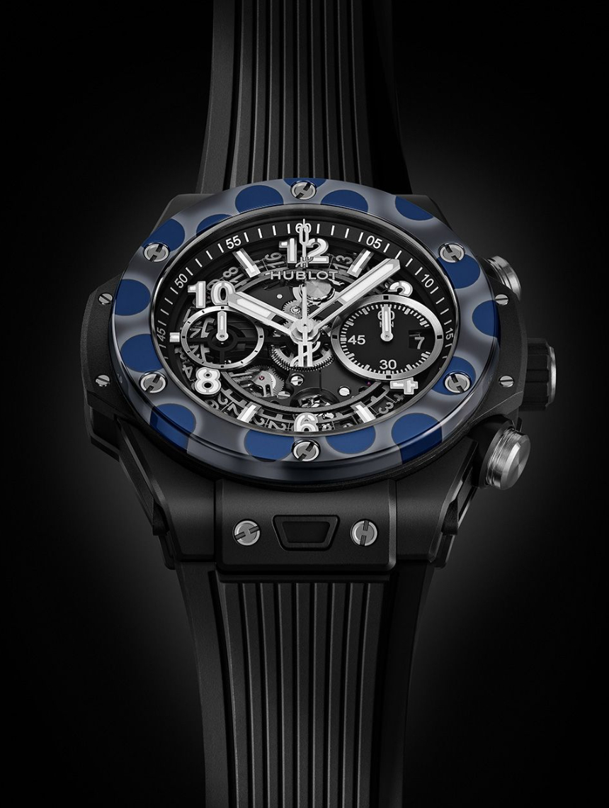 The Big Bang Unico Magic Ceramic is the world's first watch to feature multicolored ceramic—a polished, dark grey ceramic bezel with vivid twilight blue circles that give the watch an abstract or pop-art aesthetic. Developed over four years, this 42mm watch is limited to 20 pieces. It is powered by the automatic HUB1280 UNICO offering a 72-hour power reserve.