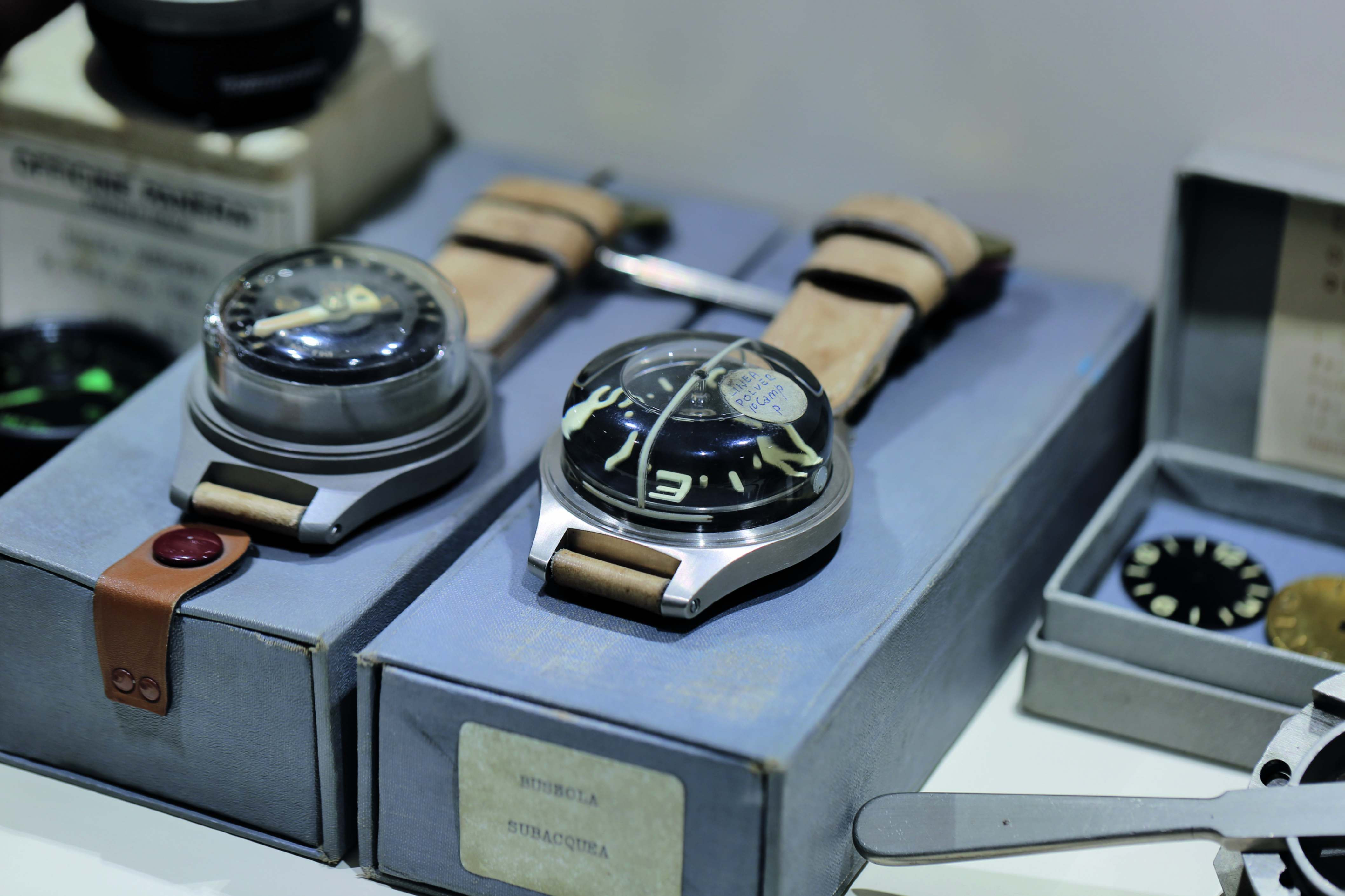 On the first floor of the store, the Ferrettis have created their own version of a Panerai museum, showing a unique selection of clocks, documents (even the invoices from Rolex are on display), dive instruments, depth gauges, calculating devices, signalisation tools, spare parts, etc. from the Italian brand.