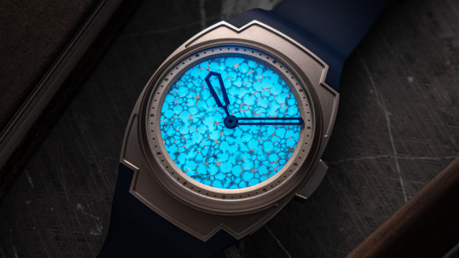 For the third sub-collection, the Experimental, unveiled in 2024, the brand creates materials that born of experiments. The brand also calls out to the public for the ideas. There’s the Bonehead model, which Black Badger created accidentally-on-purpose by mixing a chunk of aerospace-grade aluminium with an opaque resin. The resulting material was attached to a disc of electric-blue lume, creating a glowing dial with a distinct ‘marrow-esque’ pattern. The other in the line is the Tiger Sh’Arc, whose case is made with zirconium titanium composite (also called Zircuti), giving the case a pattern a lot like that of the skin of a tiger shark.