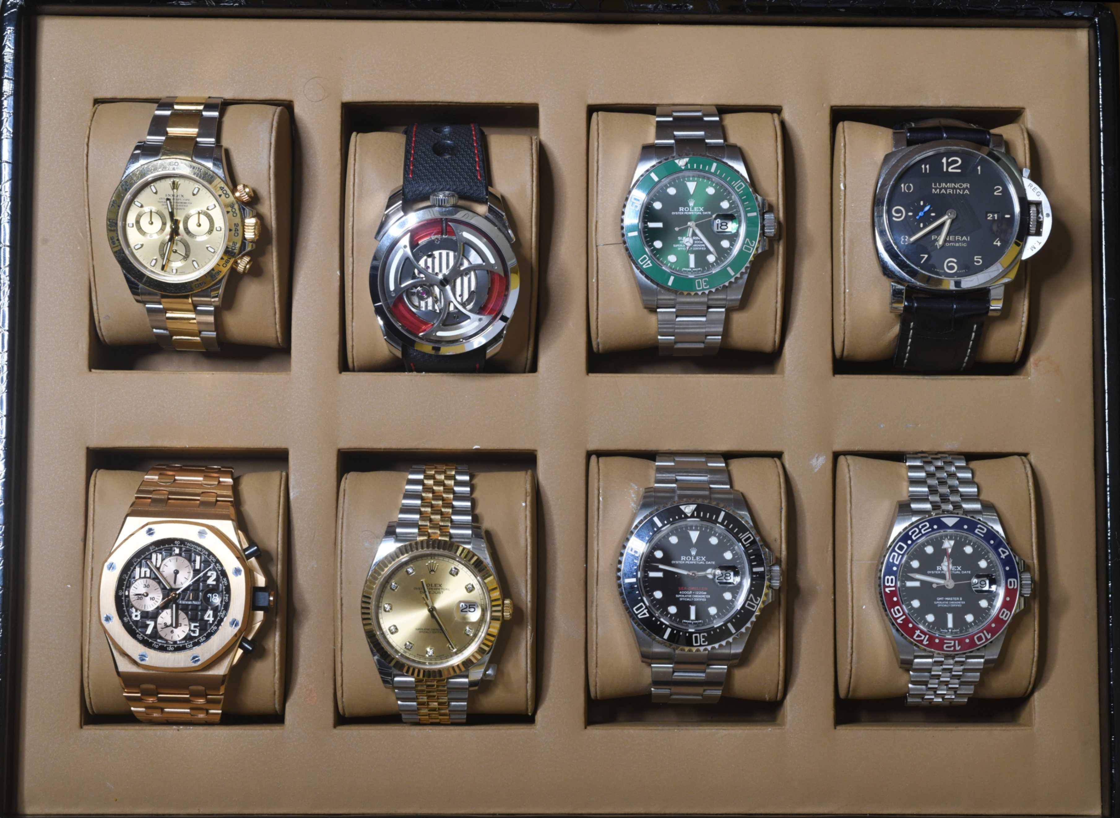 “I bought it in Dubai, in 2020. And the watch was selected by my father,” recalls Nair, Director at Metallide Chemical Industries, taking the watch off his wrist. Handing the substantially heavy piece to me, he continues, “I was going to buy the Patek Philippe Ref. 5712, but my father suggested that an AP was better for the occasion. I trust his judgment, so I went with him to shortlist the watch. I was looking at a Royal Oak Offshore with a blue dial, and was ready to give the deposit. And suddenly I saw this watch—somebody else was trying it. The watch had launched just a week before, and I liked its black and gold contrast. Once I wore it, all other watches felt insignificant because of the heft of it. But the other gentleman purchased the piece, and I had to wait for a long time to get it.” Today, this timepiece is one of Nair’s favourites, and rests in a collection that features more than 20 watches from brands like Rolex (Daytona, Day-Dates, and Sky-Dweller), Panerai, MB&F, Rado, Raymond Weil and more. I was able to enjoy some of these at close quarters, while few, Nair informed me, rested securely in his bank locker. There is also a Titan watch which his sister gave him as a graduation present, engraved with the words “Sandy, we are proud of you”.