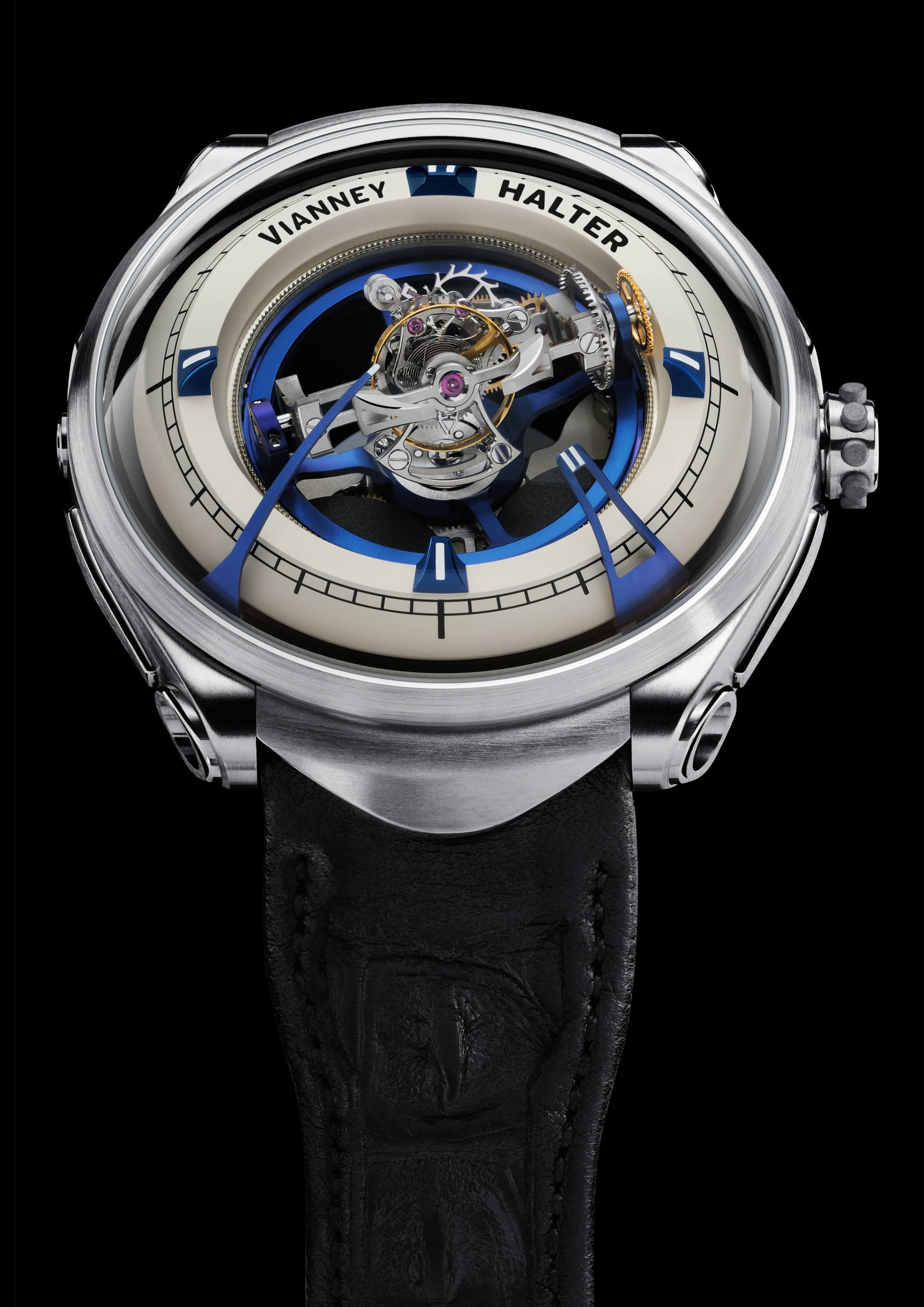 The other Halter work that startled people in the watch industry was The Deep Space Tourbillon released in 2013. Six years in the making, Halter has described the 46mm x 48mm x 20mm titanium piece as “the four dimension watch for deep space voyagers”. Its highlight was the triple-axis central tourbillon revealing the in-house movement VH113, inspired by space exploration—the tourbillon rotated at three different speeds, with one axis completing a turn in 40 seconds, another in six minutes, and the third in 30 minutes, revealing a complex mechanism. Time was displayed by two curved-blued titanium hour and minute hands which surround the tourbillon. The same year, this watch won the GPHG prize for Design & Innovation.