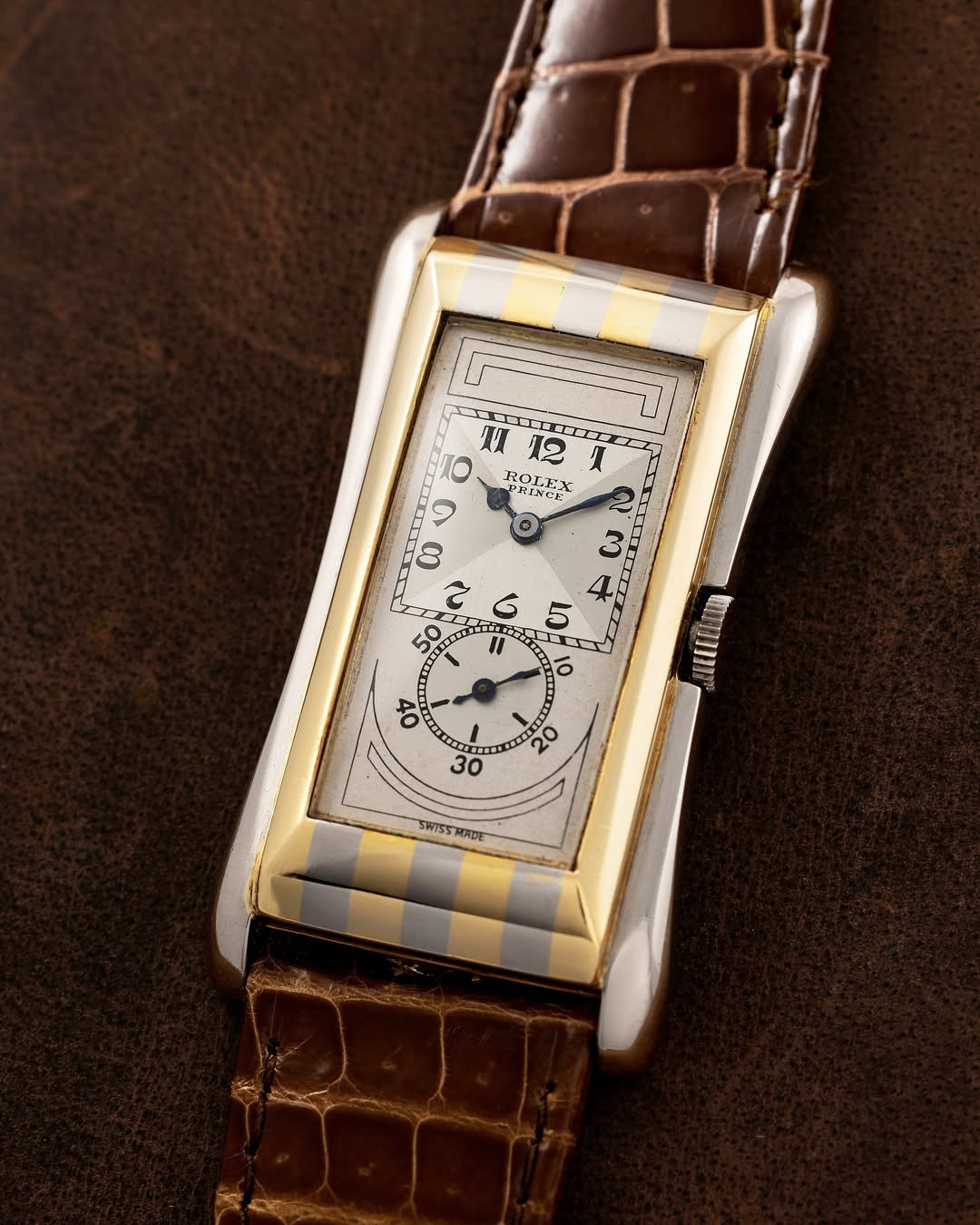 Often associated with the Art Deco style, the Prince models are among the defining rectangular wristwatches of the late 1920s and 1930s. A typical feature is the two-part dial architecture: hours and minutes at the top, and the small seconds at the bottom. This was considered particularly legible at the time and made the watches attractive for medical applications such as pulse measurement. In the collector's world, Prince variations are also valued for their design diversity and the often curved case shape that conforms to the wrist. Less well-known, but named in the same spirit, are the Rolex Princess and Rolex Queen models, which appear in historical advertisements from the early 1930s. Rolex discontinued the Prince line in the mid-20th century and relaunched it in the early 2000s within the Cellini family. This reissue, produced until 2015, could be considered a hand-wound dress watch and featured – as a unique characteristic within the brand – a display back and a rectangular movement. The Prince thus reveals a side of Rolex that is practically no longer associated with the brand today: form-conscious Art Deco watches.
