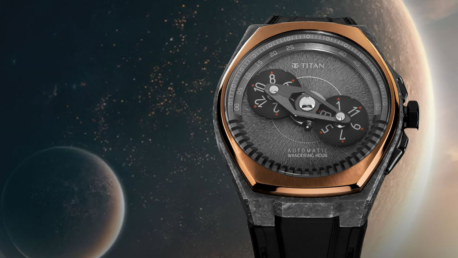 Glimpse of Titan's event in Mumbai for the launch of Wandering HoursThe Wandering Hours creates history becoming the first watch by an Indian brand to use this complication in a timepiece created fully in-house. Inspired by infinite celestial wonders, this watch is powered by Titan's in-house Calibre 7AW-D2 offering a 40-hour power reserve and boasting accuracy of -10/+30 seconds per day. The wandering hours are displayed on two satellite discs, sitting on top of a textured dial plate, reminiscent of planets orbiting on their axis. It is crafted in crystallized titanium, making the watch remarkably light, and topped with a brushed copper bezel. There is a minute track on the upper half of the dial. The exhibition caseback features a rotor accented with the moon's texture. It comes dressed with an aeronautical grade FKM rubber strap. It retails for ₹1,79,995.