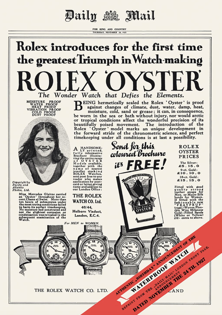 As the lore goes, in 1927, Rolex put its claim of Oyster being waterproof to the ultimate test. A young British swimmer, Mercedes Gleitze, undertook a daring attempt to cross the English Channel wearing a Rolex Oyster around her neck. For more than 10 grueling hours in frigid waters, the watch endured relentless waves and shifting tides — and emerged ticking perfectly. To commemorate this remarkable feat, Rolex took out a full-page advertisement on the front page of the Daily Mail, proudly declaring the triumph of the waterproof Oyster. More than a marketing milestone, it was the birth of Rolex’s enduring Testimonee concept — a philosophy of proving excellence through human achievement.