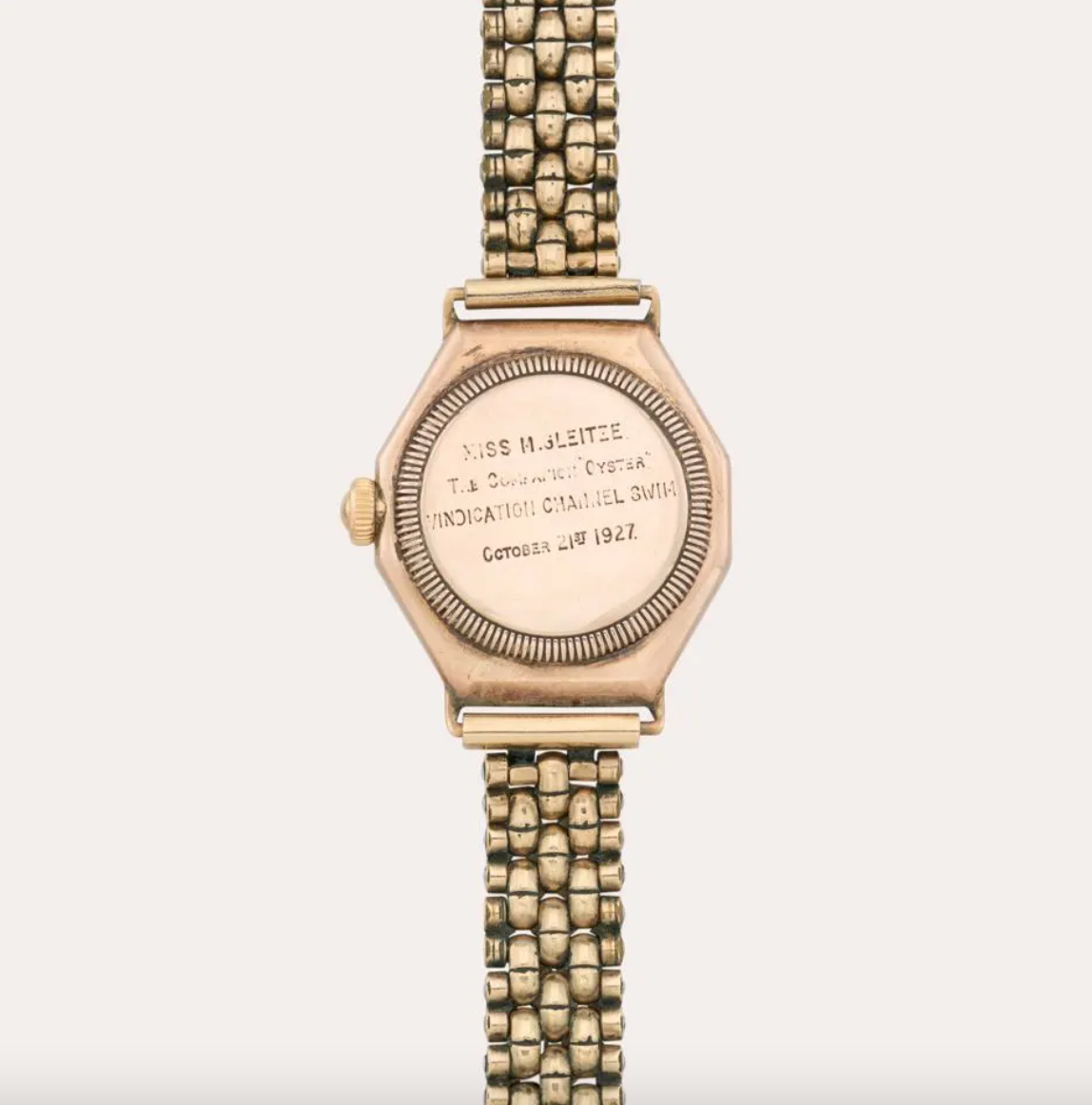 The watch is estimated to bag more than 1M Swiss francs ( approx. USD 1.3M). It was last sold at auction for 17,037 British Pounds sterling by Christie’s in June 2000, marking its value up by 5500%. The watch’s caseback is engraved with ‘Miss M. Gleitze. The Companion 'Oyster.' Vindication Channel Swim. October 21st. 1927’