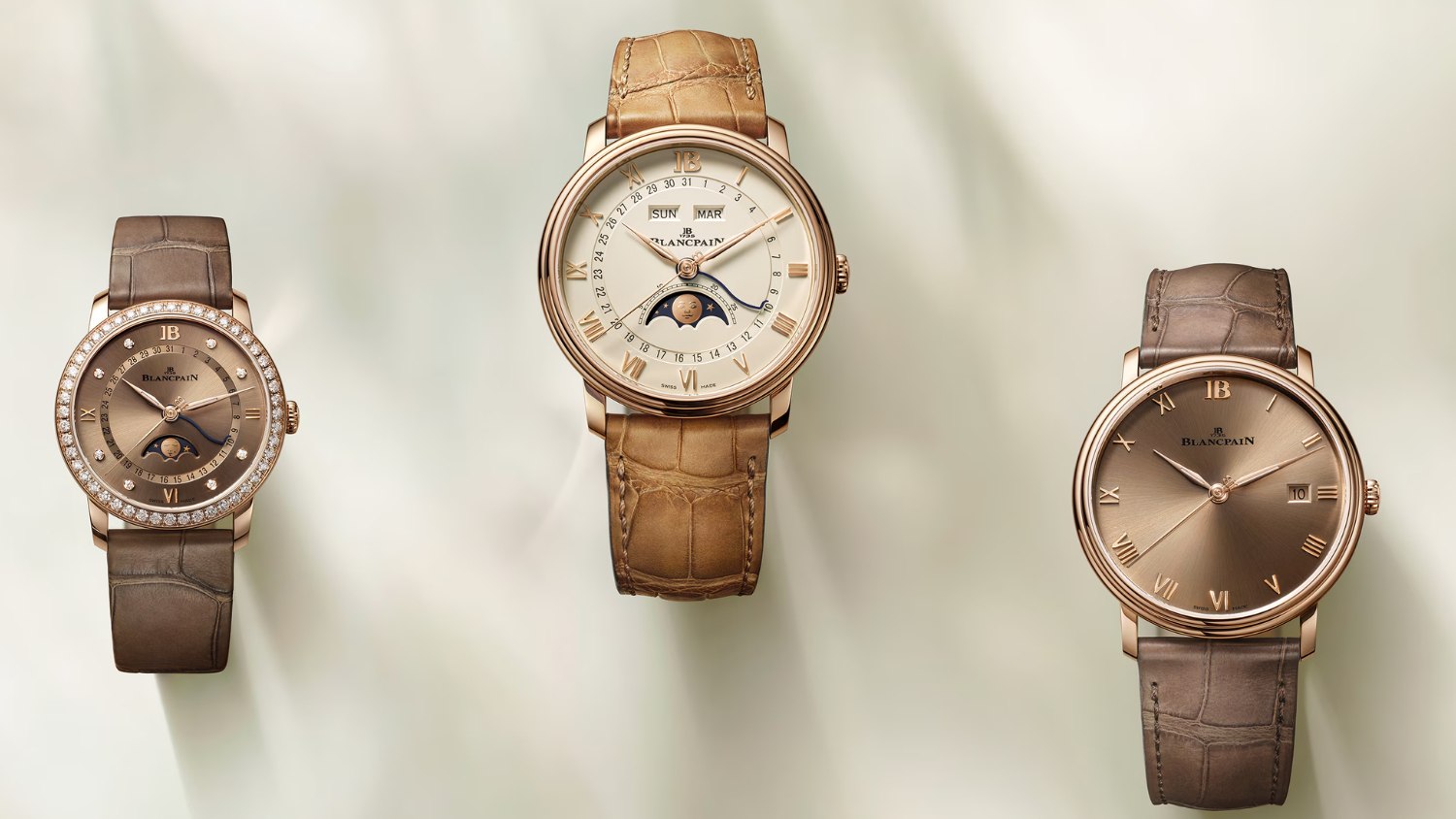 All 16 references are offered with strap options in blue-grey, honey, brown, or beige leather with folding clasps.