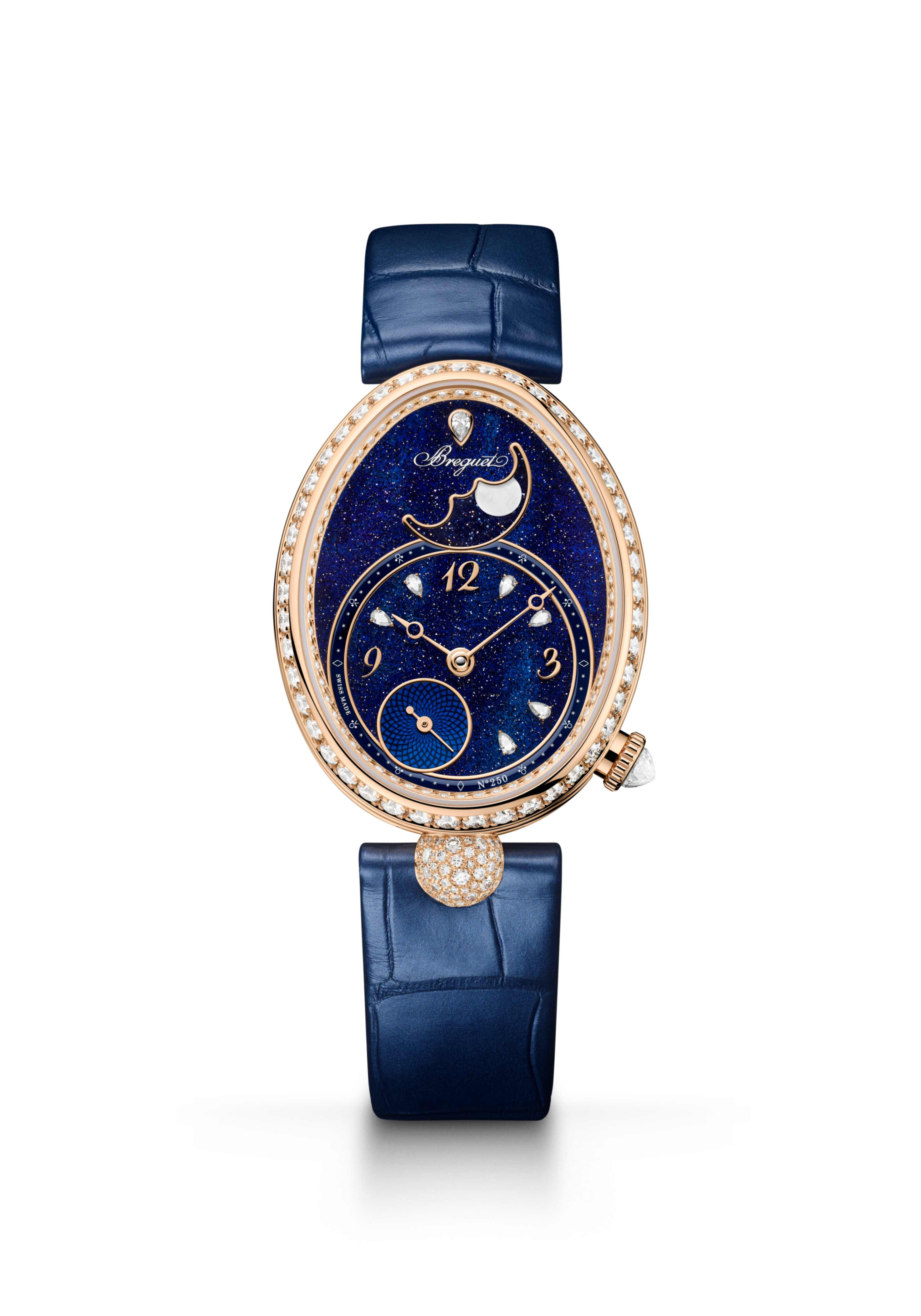 The Reine de Naples 9935 is the first fully feminine timepiece that marks the celebrations, which have seen important releases all through the year. It comes in three variations: Blue aventurine dial on a satin-finish alligator strap, white mother-of-pearl dial on gold bracelet or leather strap, and fully diamond-set version with over 1,300 gemstones.