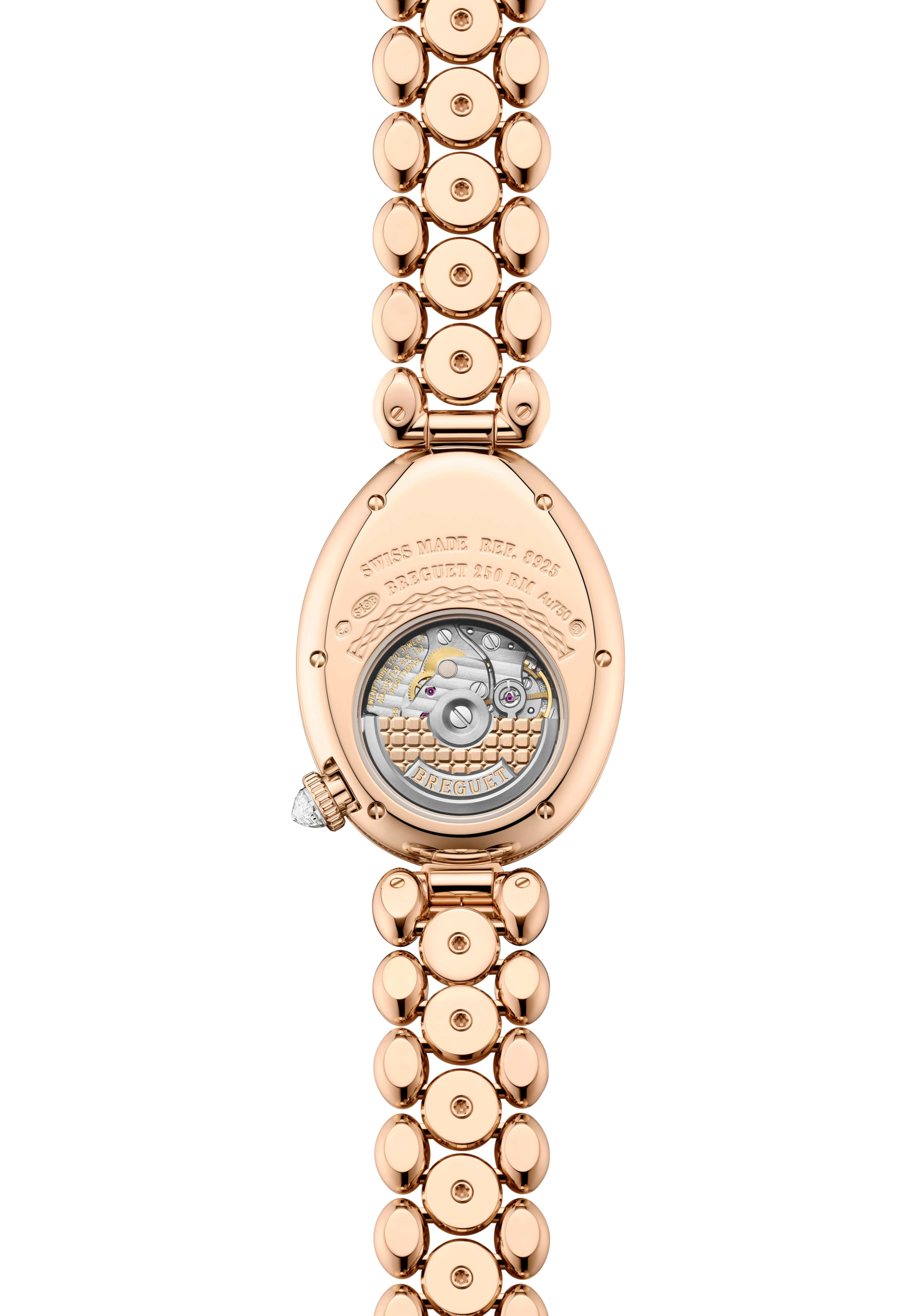 The Reine de Naples 8925 displays only hours and minutes. Its 33 X 25 mm Breguet gold case is framed by 107 diamonds and features a single pear-shaped diamond at 12 o’clock — a hallmark of the collection. The watch debuts a newly densified bezel set with 107 brilliant-cut diamonds and introduces a snow-set central lug at 6 o’clock. There is an off-set hour chapter finished with hand-guilloché “Quai de l’Horloge” motif and features 46 diamonds on the chapter ring. It is available in three dial options: Extra-white mother-of-pearl with classic gold numerals, all-gold guilloché with a sunburst dial and gold bracelet, and a black aventurine and lacquered gold version. Inside beats the Calibre 586/1 with quiet precision, featuring a platinum rotor engraved with the Petit Trianon motif — a signature that connects every anniversary piece in this collection. It offers a 38-hour power reserve.