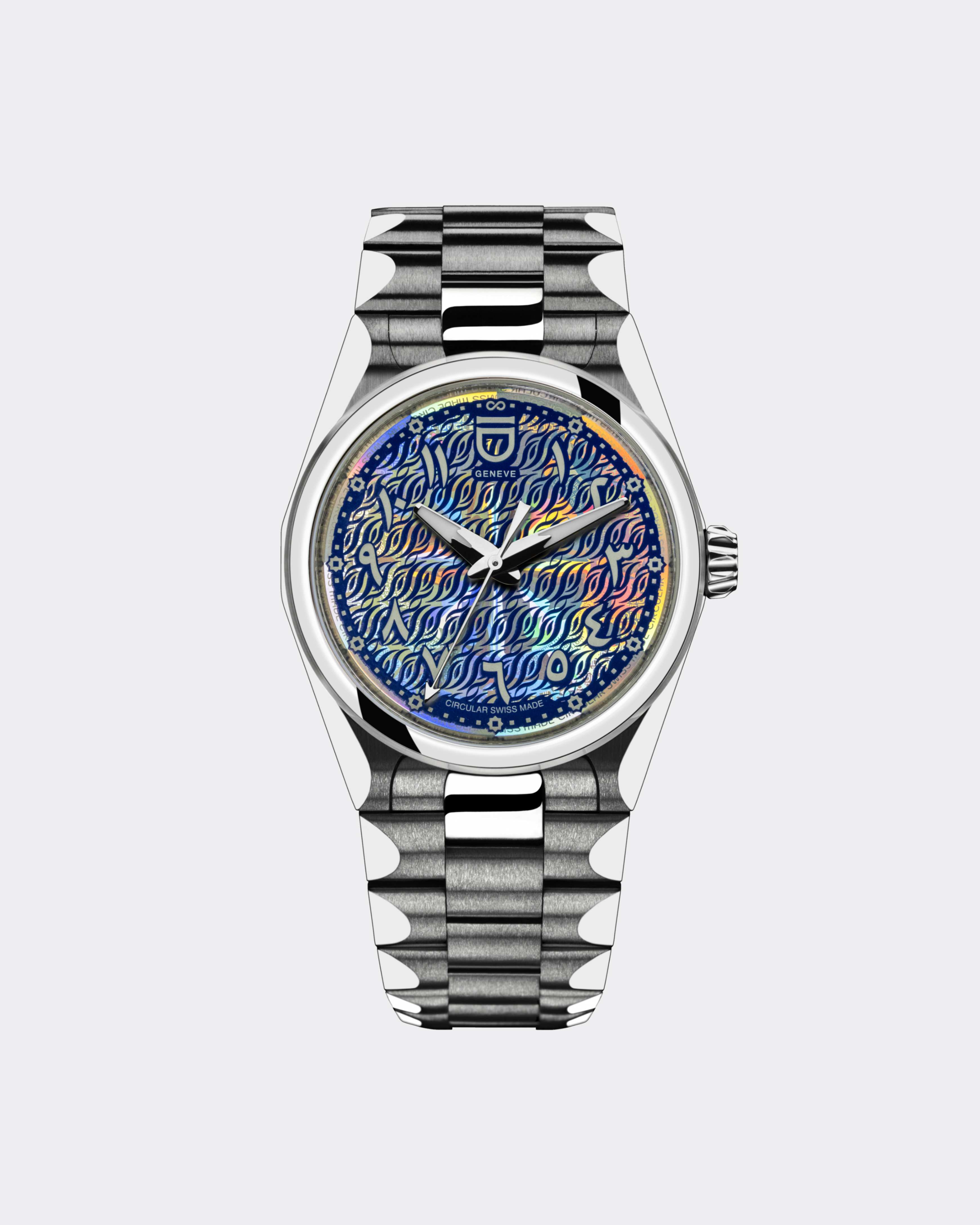 Inspired by the fluid movement of sand shaped by desert winds, the MorphoDune’s dial features undulating, dune-like motifs interlaced with geometric forms inspired by Arabic art. Arabic numerals, enhanced by Super-LumiNova, highlight that glow. The 37 mm case is crafted entirely from reprocessed 316L stainless steel, paired with an integrated bracelet, handmade in Le Locle. The bracelet mirrors the rolling waves of sand through semi-elliptical brushed and polished links, while a discreet accent of spiritual blue nods to a colour deeply rooted in Arabic culture, symbolising peace and protection.