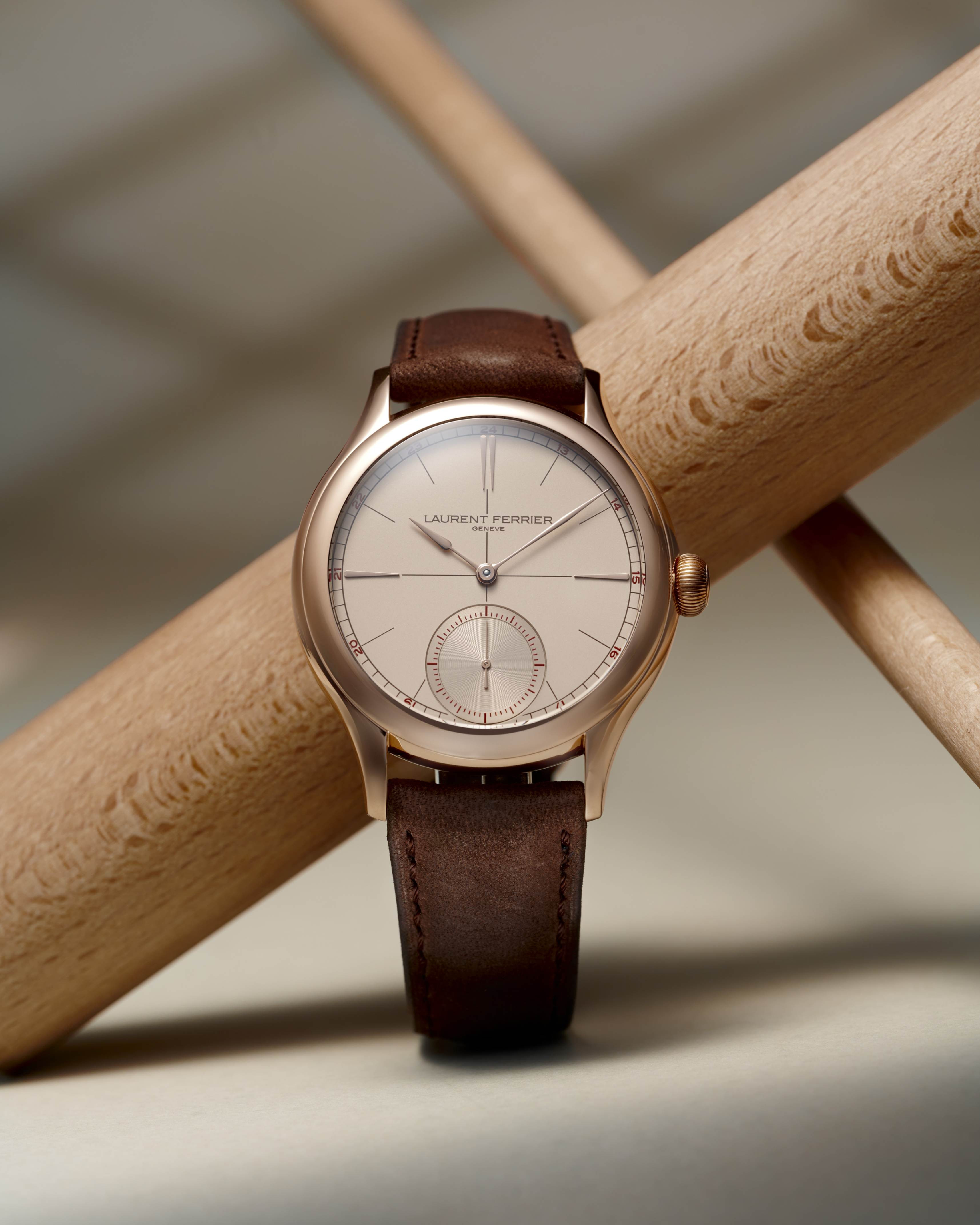 The new model retains the proportions of the 40 mm Classic’s case with curves reminiscent of a river-smoothed pebble. However, for the first time in the line, this case is crafted in 5N red gold paired with a new beige dial, bringing warmth to the collection. The dial echoes the minimalist ethos of the brand with an opaline finish dial featuring a brown railway track marking minutes with red numerals on the periphery of the dial. There is a central cross and 18-karat 5N red gold hour makers at 3, 9 and 12 o’clock, while a small-seconds, also in red, sits at 6 o’clock. Baton-shaped red-gold hands mark the seconds, while Assegai-shaped central hands in red gold mark the hour and minutes. There is a signature ball-shaped crown at 3 o’clock matching the dial.