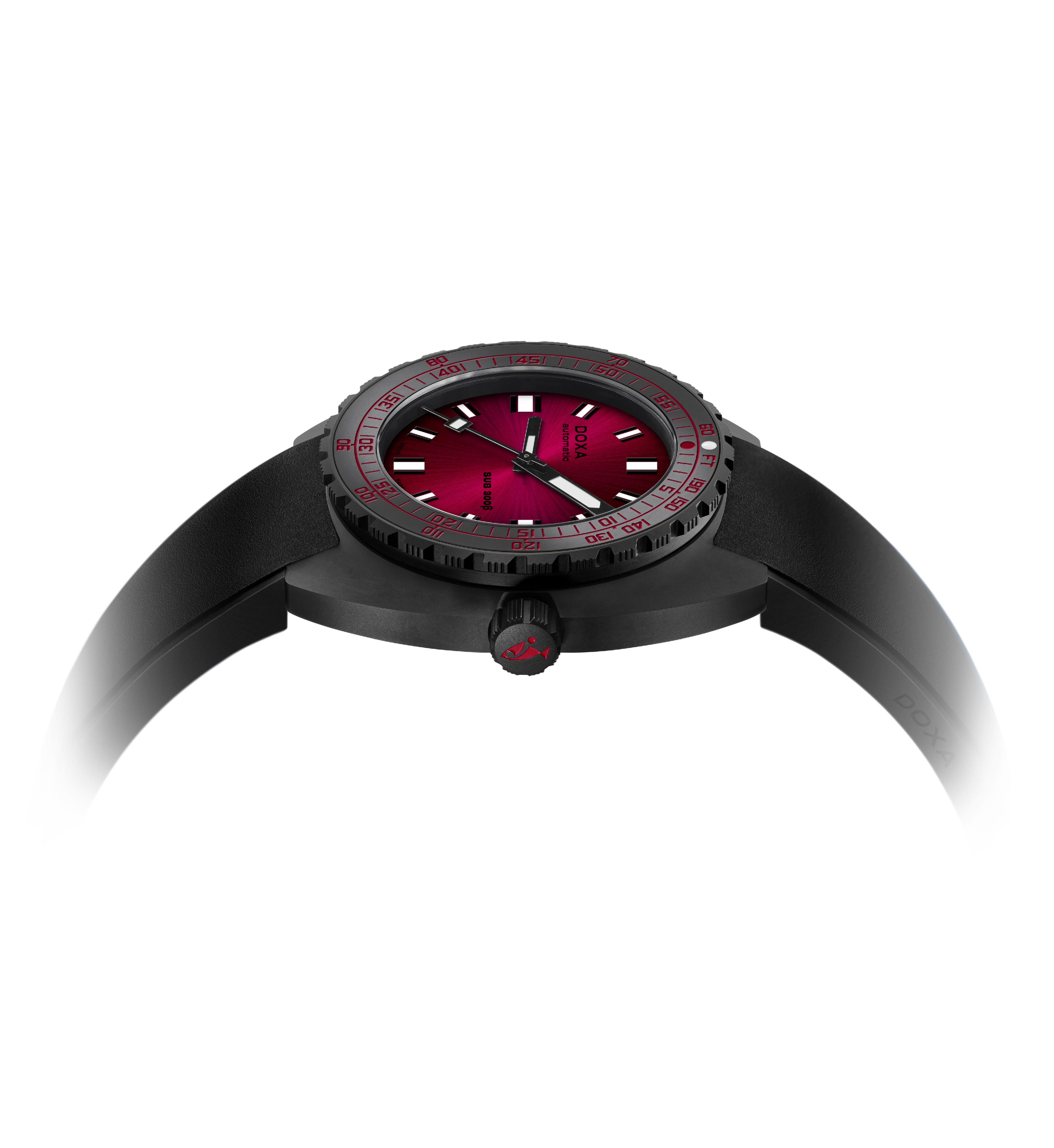 Encased in a matte black ceramic case measuring 42.50 mm x 44.50 mm, it features a sunburst cherry-red dial. The central hands and indexes are filled generously with white Super-LumiNova®, ensuring superb legibility underwater or after dark. Even the unidirectional bezel features a tone-on-tone cherry-red painted engravings of the inner minute track, and the outer ring indicating depth in feet, with a white Super-LumiNova® marker at 12 o’clock.