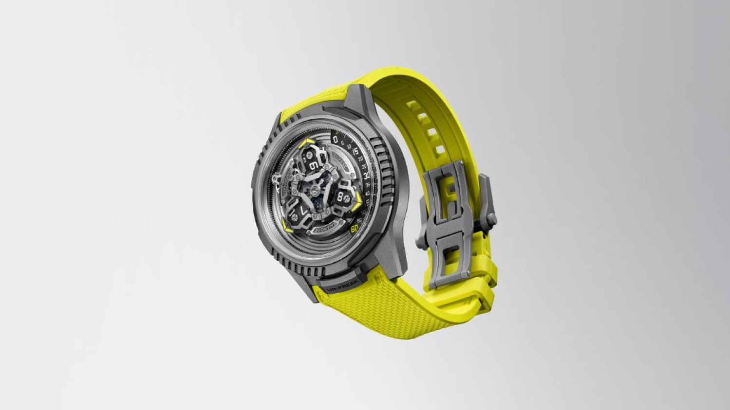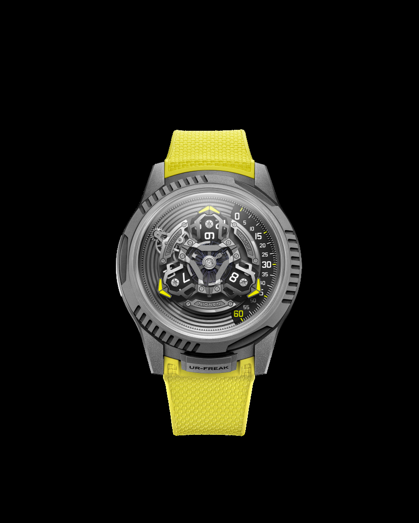 The case is based on the 44 mm Ulysse Nardin Freak ONE platform, executed here in Urwerk’s sandblasted gray anthracite titanium. Urwekr adds its own structural language, including three fluted sections on the rotating bezel and caseback. Accents in electric yellow (Pantone 395 C) highlight key functional elements: the satellite pointers, minute track markers, and the custom rubber strap. True to the Freak concept, the UR-FREAK has no crown. Time-setting is performed through the rotating bezel, secured by a “locker” tab at 6 o’clock. Lifting the locker releases the bezel, allowing the user to adjust the hands. Winding is automatic through Ulysse Nardin’s Grinder® system, though the movement can also be manually wound via the caseback. Despite the sliding-bezel interface, the case maintains 30 metres of water resistance.