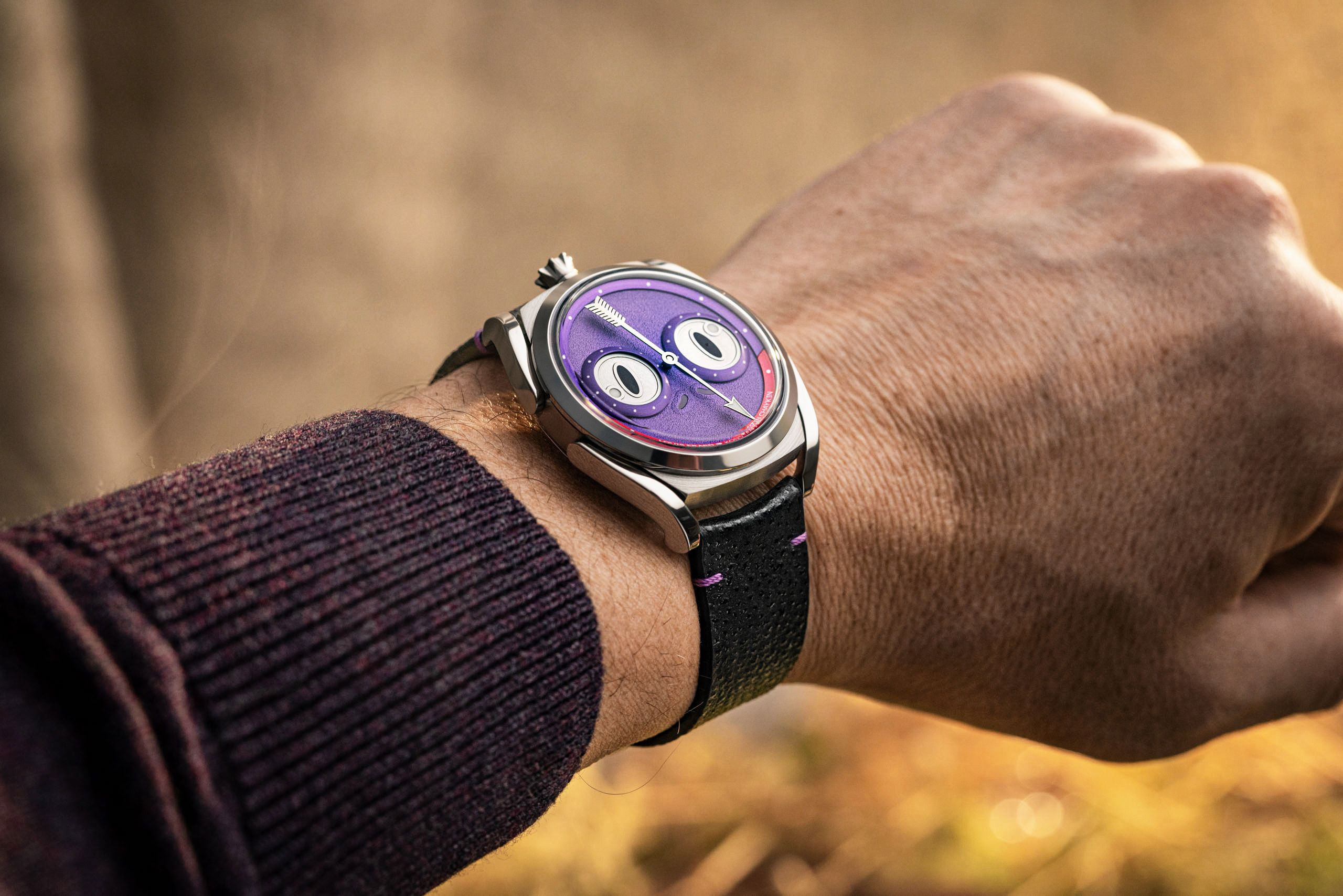 At the centre is an arrow-shaped minute hand—a subtle reference to the Frog Princess tale—while the dial itself is built on textured layers, available in either a deep forest green or a rich violet. Lacquered nostrils, just below the pupils, add another playful touch. It is complemented by a two-tone minute track featuring a red segment marked with the Louis Erard and Konstantin Chaykin logos in white transfers at 6 o’clock. In a final twist of humour, the crown (crafted in Grade 5 titanium in both models, but comes with a 2N gold PVD treatment for the green model) sits at 12 o’clock—a nod, as the brand puts it, to the fact that this frog is a princess. The movement, a Sellita SW266-1 modified for the regulator layout, beats at 4 Hz and offers a 38-hour power reserve. It is elaboré grade, equipped with a custom openworked rotor lacquered in black, and visible through the sapphire caseback engraved with the limited edition number, ‘1 of 178.’
