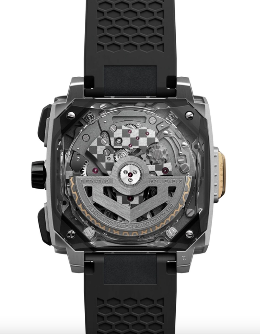 The Calibre TH81-00 ensures precise operation – one of the brand's most technically sophisticated movements. Developed in collaboration with Vaucher Manufacture Fleurier, it combines the rattrapante function for dual timekeeping at a frequency of five hertz and delivers a 65-hour power reserve. Numerous small and very small components are also made of Grade 5 titanium – an extremely demanding material for watch movements. The result is a record-breaking movement weight of just 30 grams. The decorative finishing is done by hand, including the iconic checkered flag motif, visible through the case back crafted entirely from sapphire crystal.