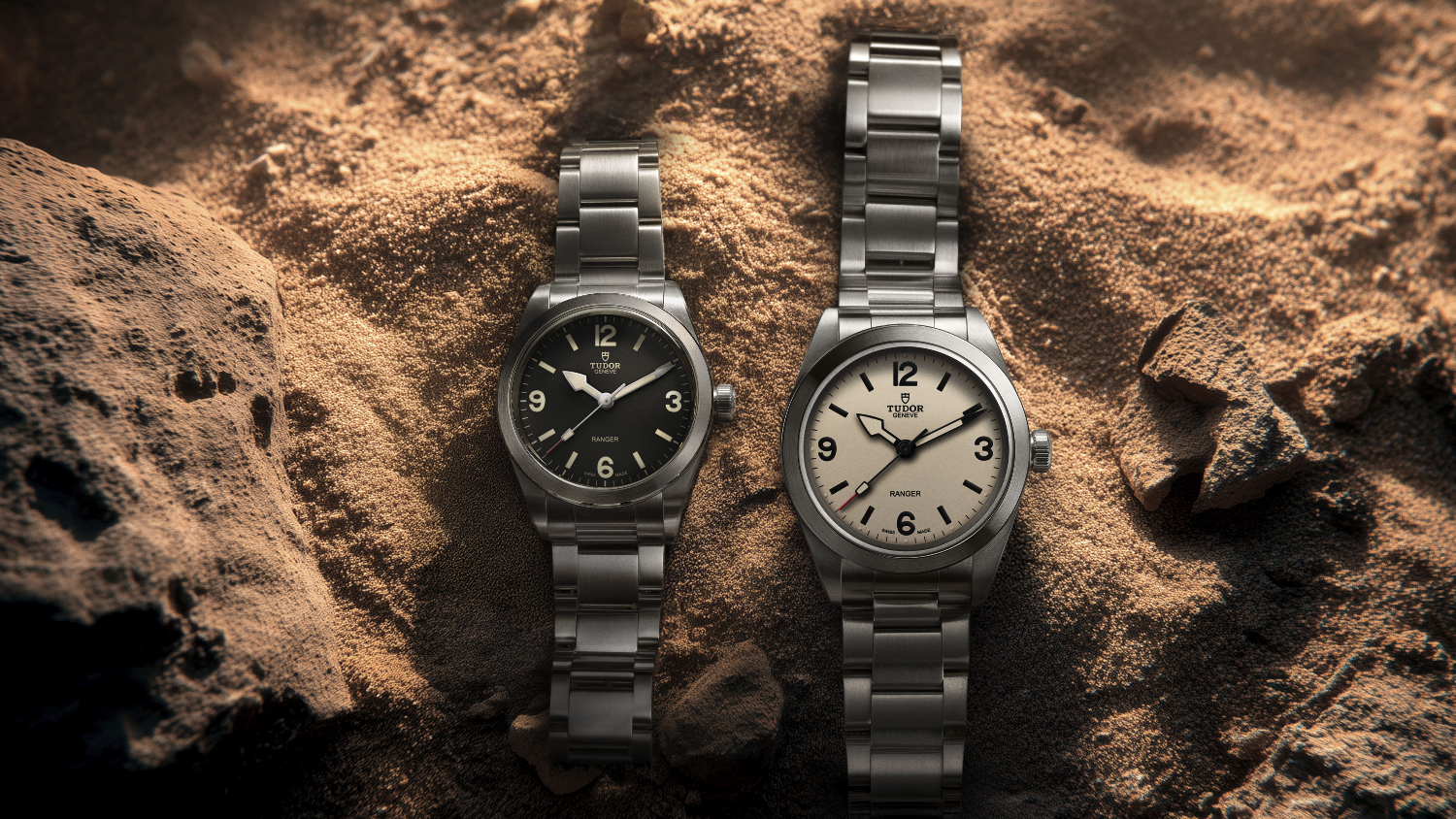 Aesthetically, the new models follow the codes of the 1960s Ranger models with large arabic numerals at 12, 3, 6 and 9 o’clock. The hour markers are painted and coated with Grade A Swiss Super-LumiNova® luminescent material. In either black or beige, contrasting with the respective model dials. There are arrow-shaped central hands, with a rounded edge for hours and angular for seconds hand. The seconds hand also retains Ranger aesthetics with the tip painted in burgundy. The case is crafted in 316L steel with a fixed bezel decorated with satin-brushed along with the bracelet. Some elements, however, are polished to strengthen the lines of the case, including the edge of the bezel.