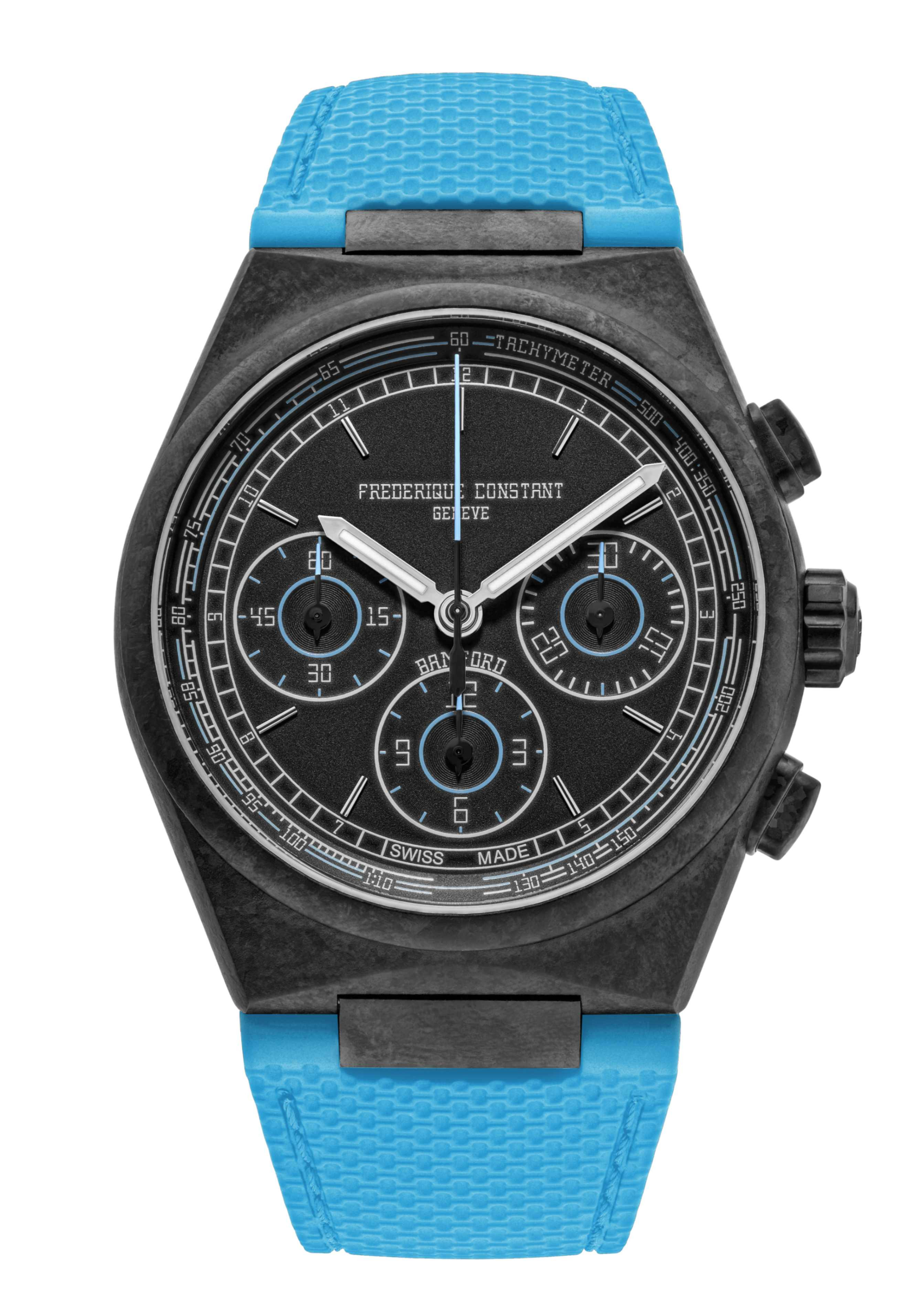 Inside, the watch continues to rely on the FC-391 automatic chronograph calibre supplied by La Joux-Perret, providing a 60-hour power reserve, and is decorated with Côtes de Genève. The movement is visible through a smoked sapphire caseback. Each of the 100 pieces is delivered with three straps: black rubber, turquoise rubber, and black nubuck calfskin. The set is supplied in a dedicated presentation box produced specifically for this edition.