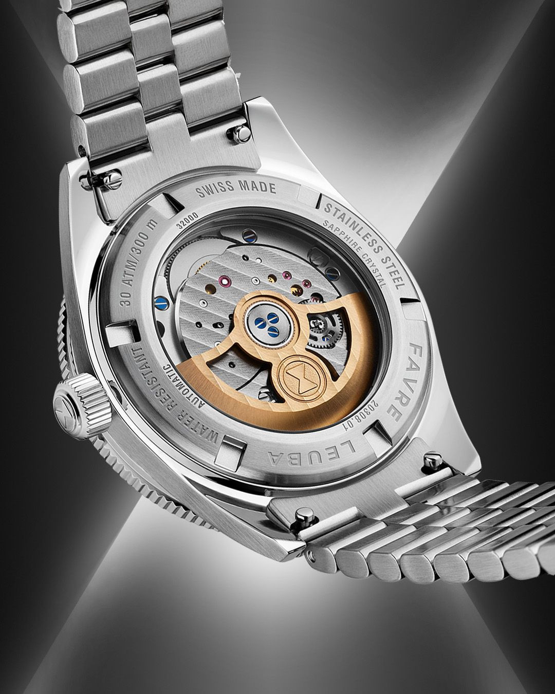 Both models share the same technical specifications. The 40 mm stainless-steel case offers 300 metres of water resistance, a unidirectional ceramic bezel with a luminous reference point at 12 o’clock, and a double-domed sapphire crystal with anti-reflective coating. A sapphire caseback reveals the automatic FLD02 movement, operating at 4 Hz with a 68-hour power reserve. The calibre features Côtes de Genève, perlage, blued screws, and a skeletonised 4N-toned rotor with the Favre Leuba emblem.