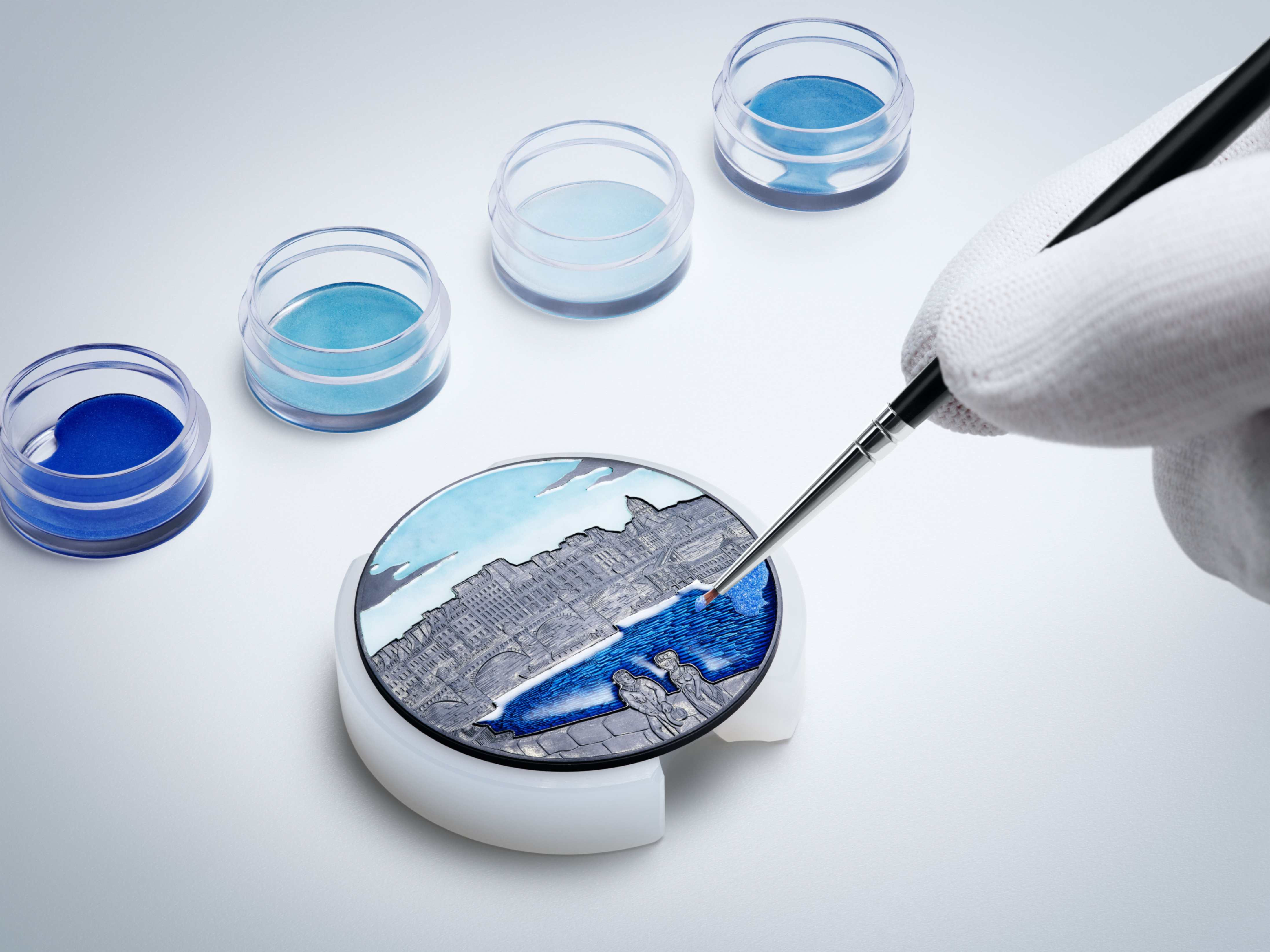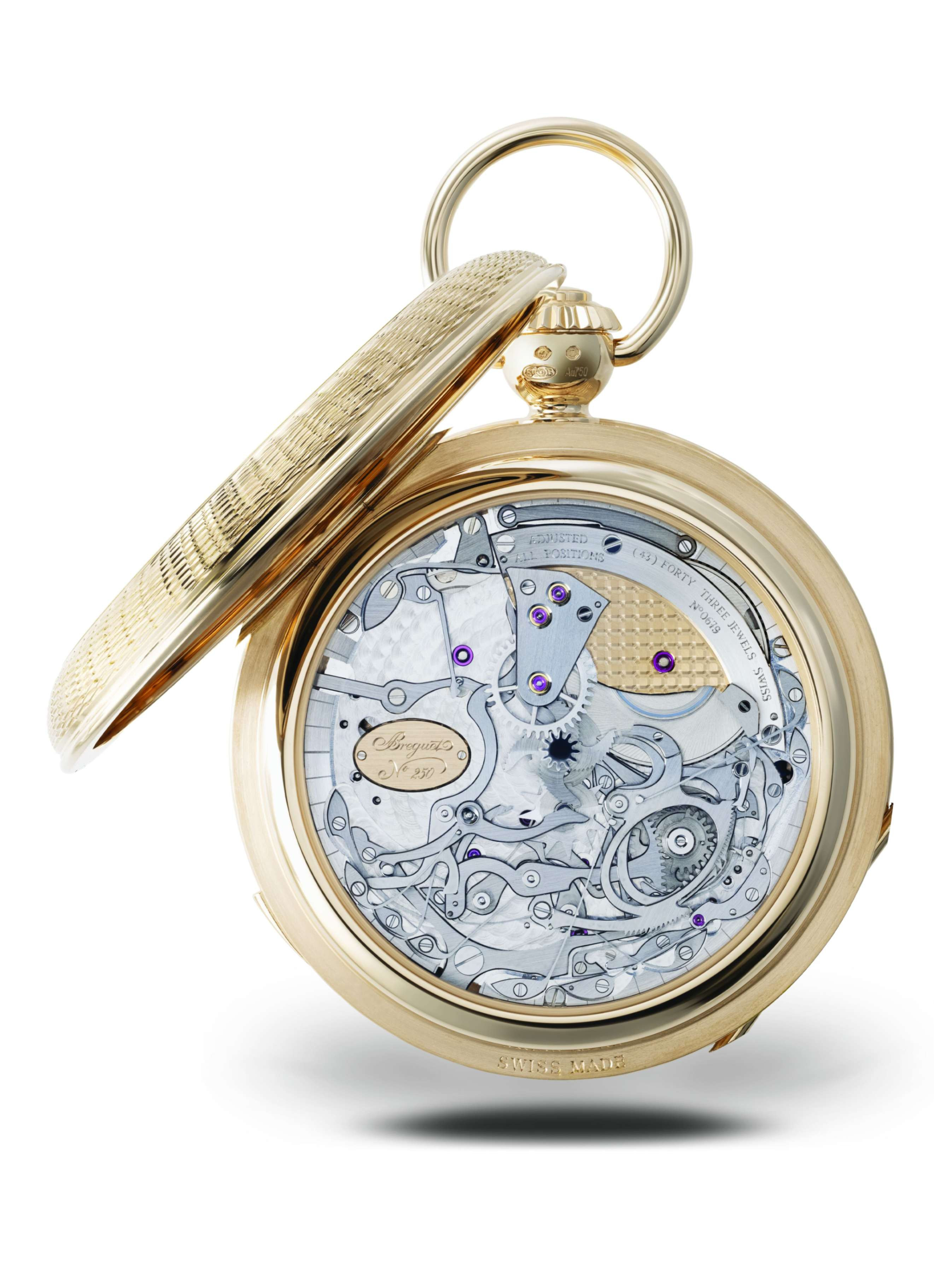 The gong spring system is protected by two patents of Breguet inventions of the gong and the gold gong spring. Only the hammers appear on the dial side. The full chiming mechanism, including the grande sonnerie and minute repeater strike train, is visible when the hunter-style back—guilloché with the Quai de l’Horloge motif and Bleu de France enamel—is opened. All components of the mechanism are decorated by hand through traditional techniques including drawn lines, bevelling, stretching, and encapsulating.