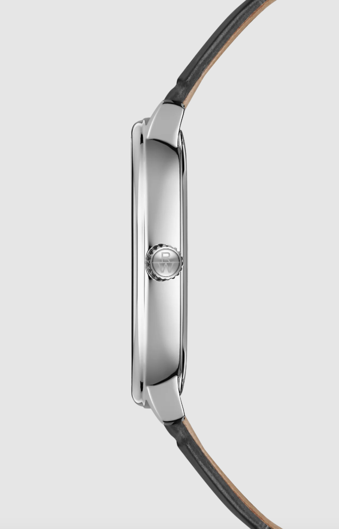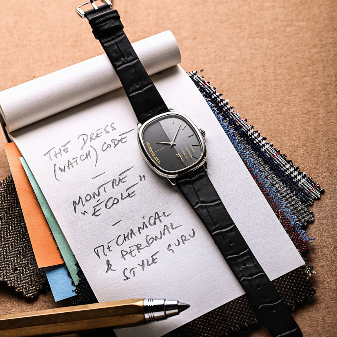 The limited edition is housed in a 37.7 × 32.5 mm stainless-steel case that measures just 6.95 mm in height. Its oval silhouette originates from a case shape introduced by founder Raymond Weil some 40 years ago — defined by its slim profile and softly rounded contours. Today, under CEO Elie Bernheim, the Toccata line has been updated while preserving its vintage character. The seconde/seconde/ collaboration extends this philosophy: maintaining the refinement of the original while questioning dresswatch conventions directly on the dial.