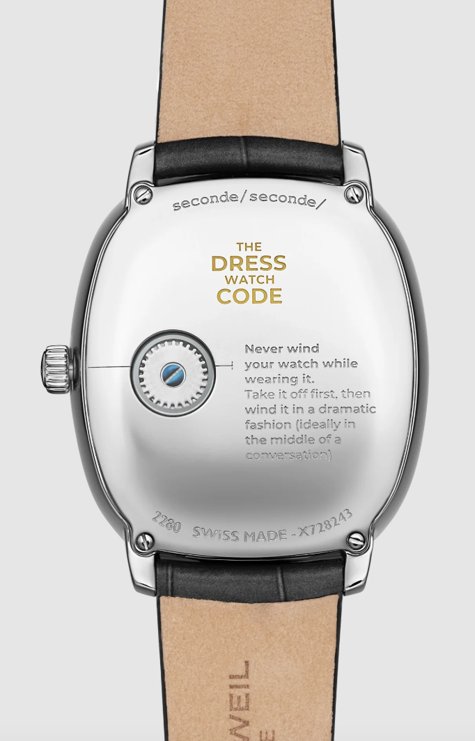 The grey dial is split into two contrasting sections. On the left, a matte, opaline finish paired with translucent indexes creates a ghostly, veiled appearance — a nod to a shirt cuff that covers much of the watch. A yellow inscription at 9 o’clock declares: “Dress shirt cuff should cover at least half of the watch.” The right side reveals anthracite sunburst reflections and a polished minute track, maintaining classic elegance. A typographic detail adds further charm: “Swiss Made,” along with all other dial inscriptions, offering additional tongue-in-cheek style directives, is vertically aligned.