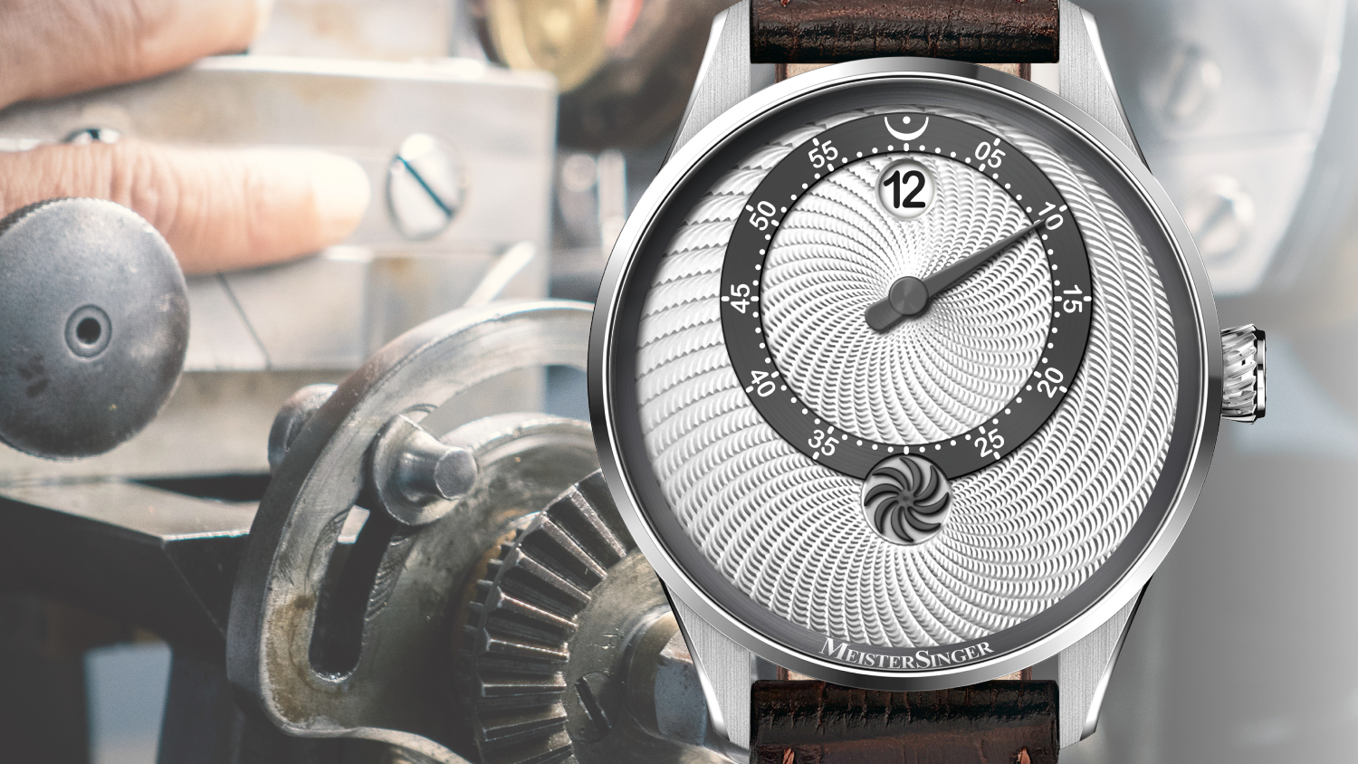Encased in refined 40.5 mm stainless steel cases and featuring spiral-shaped crown, the watches are offered with calf leather straps—brown for the guilloche piece, and glossy black and white with matching dials.