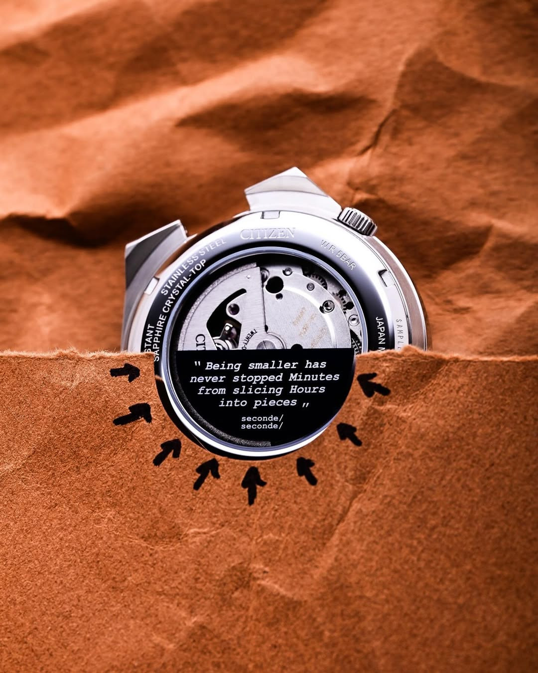 The transparent case back carries a printed message: “Being smaller has never stopped Minutes from slicing Hours into pieces.” It comes paired with a three-link metal bracelet, on the clasp of which are engraved slashes that continue the theme of the watch. The model is limited to 3,600 pieces worldwide. The number refers to the 3,600 seconds that make up one hour, reinforcing the slicing metaphor created by the katana-shaped minute hand.