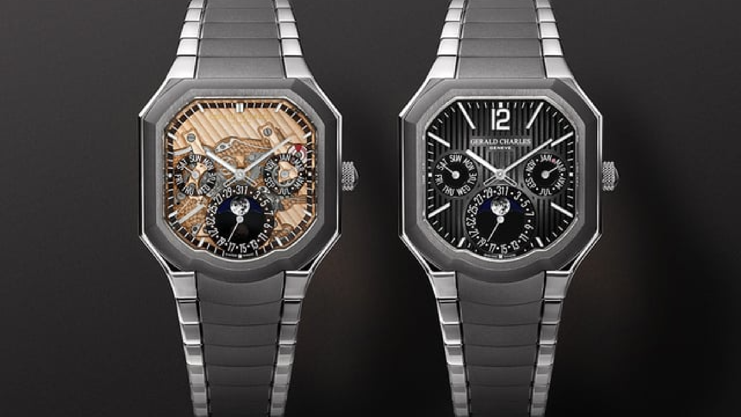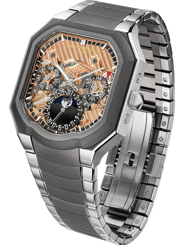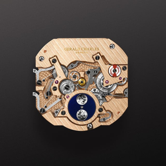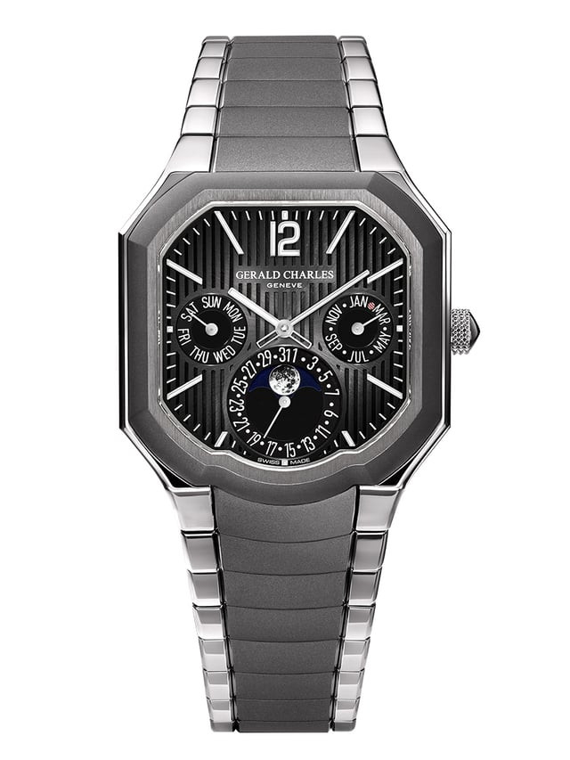 The 40 × 40mm case is crafted from Grade 5 titanium and consists of 33 components, combining lightness with structural rigidity. Measuring just 10mm in thickness and weighing only 97 grams, the watch underscores Gerald Charles’s focus on ergonomics through its proprietary Ergonteq design principles. The case integrates a screw-down crown with Clous de Paris finishing and is paired with a fully integrated titanium bracelet composed of 151 parts. Both case and bracelet feature a sophisticated interplay of finishes, including brushed, polished, and the brand’s proprietary Darkblast treatment, which enhances scratch resistance while delivering a distinctive matte, almost tactile surface.