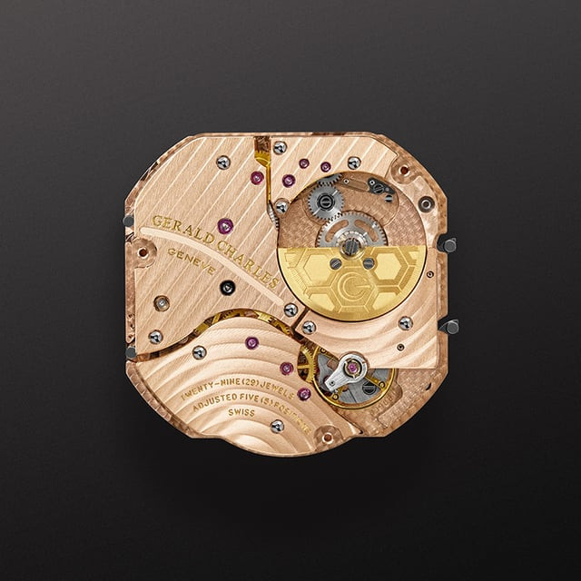 At the heart of the watch is the newly developed calibre GCA11000, an ultra-thin, shaped automatic movement measuring just 4.63mm in height. Comprising 306 components, it operates at a frequency of 3 Hz and delivers a power reserve of approximately 50 hours. The bespoke movement is wound via an offset 3N gold micro-rotor engraved with a hexagonal motif, and serves as a platform for future complications. Visible through the sapphire caseback, the movement is decorated with a high level of traditional finishing, including Côtes de Genève, perlage, and hand-executed anglage. The bridges and mainplate are arranged to evoke the topography of Geneva, with straight and curved Geneva stripes symbolising the city’s streets and Lake Léman, respectively. The transparent caseback itself— also asymmetrical— required the development of bespoke gaskets to maintain water resistance, underscoring the technical ambition behind the project.