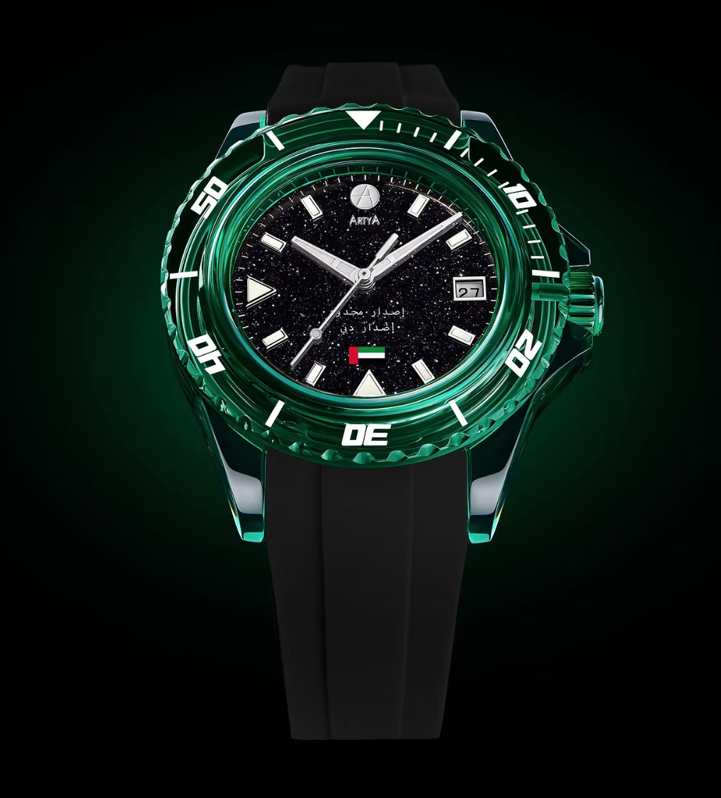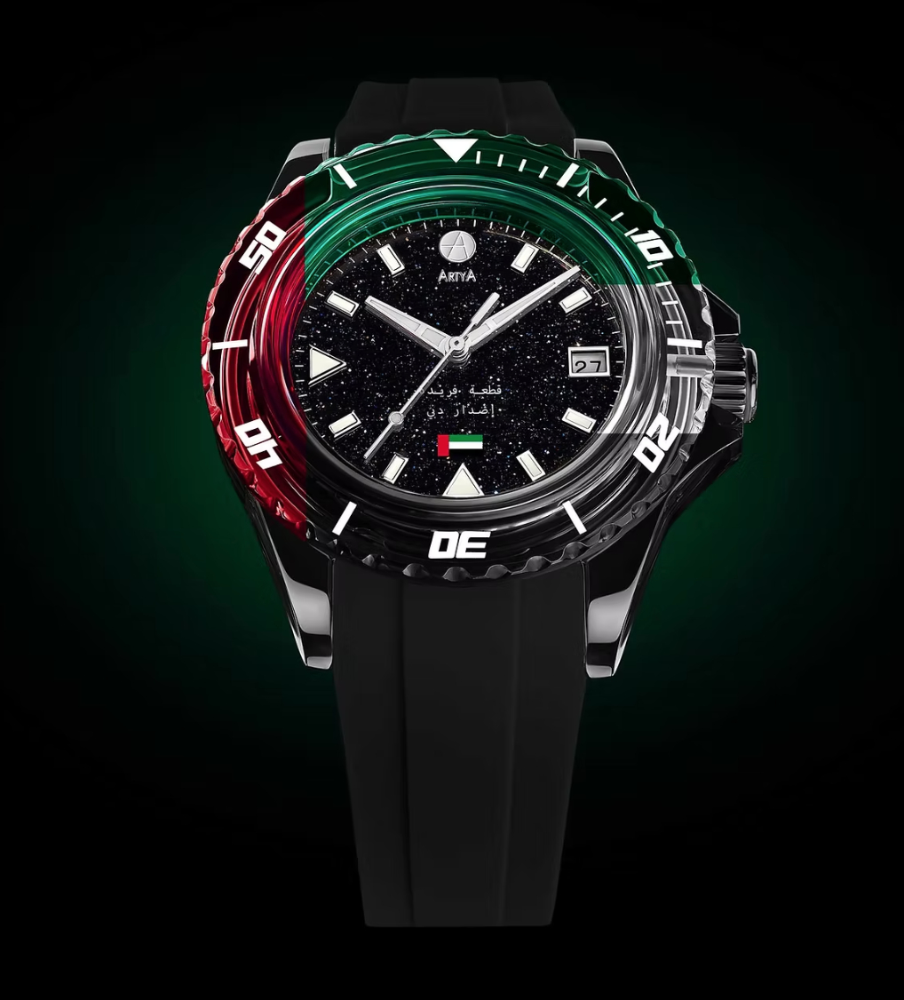 For Dubai Watch Week 2025, Artya is introducing a world first : a sapphire crystal bezel in four different colors. Here, too, it is NanoSapphire that makes this spectacle possible. On the AS-DWW25-01 , a unique piece, one section of the unidirectional rotating ring is finished in red, green, black, and transparent. The colors are inspired by the flag of the United Arab Emirates, with the transparent sapphire representing white. The flag is also featured in the lower part of the dial, below two lines of Arabic script meaning "Limited Edition" and "Dubai Edition," respectively. Together with the dial made of natural aventurine, whose sparkle evokes the desert night sky, this creates a spectacular image. To complement this, the three hands for hours, minutes, and seconds are coated with Super-LumiNova BGW9, ensuring excellent legibility in all lighting conditions. The center of the 41 mm case is made of deep black sapphire crystal.